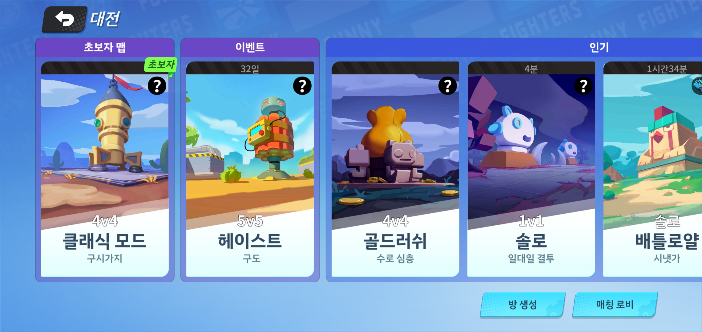 모드는 앞서도 말했지만 상당히 세분화되어있었다. 클래식 모드, 헤이스트, 골드러쉬, 솔로, 배틀로얄 등등 개인전에서 부터 1vs1, 4vs4, 5vs5... 많은데 솔직히 클래식 모드는... 좀 재미가 없었다. 개인적으로는. 가장 괜찮았던 건 '배틀로얄'인데 유저가 잘 안보여서 그게 아쉬웠다. 하긴 뭐 초보자존이니까 없는 게 당연하겠지만 유저를 만날 수 있는 정도까지 점수를 올리는 과정이 상당히 좀 반복 노가다 같은 느낌을 들게 할 것이라서 솔직히 게임 자체는 더 하려면 할 수는 있는데 그렇다고 완전하게 재미를 주는 것도 아니면서 유저풀은 적어서 그냥 적당히 잘 즐기고 갈 것 같다.