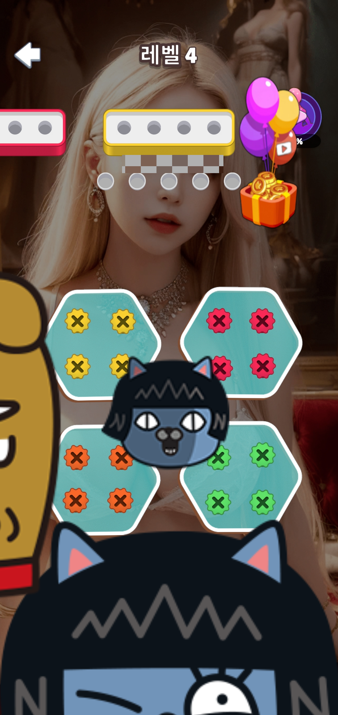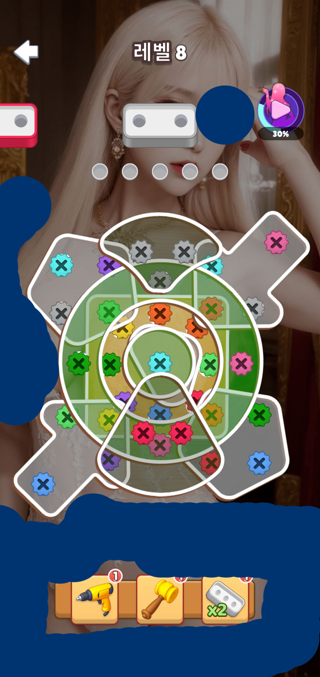 나사 넣는 곳 그 바로 아래에 보면 '5개의 회색 원'이 있다. 이거는 '대기실'이라고 보면 되겠다. 5개 다 채워지면 게임오버되기 때문에 '4개까지만' 준비시켜놓을 수 있는 인벤토리이다. 즉, 위 사진처럼 이제 점점 퍼즐의 난이도가 높아져서 나사 박힌 판들이 겹겹이 쌓여져있다. 무조건 가장 최상층 나사판에 박힌 나사만 풀 수 있는 건 아니고 그냥 유저 시점에서 가려지지 않은 나사들은 다 뽑을 수 있다. 즉, 약간이라도 가려져있으면 그 나사는 뺄 수 없다. 완전하게 오픈되어있는 나사만 빼낼 수 있어서 예를 들어 빨간색 나사 3개가 필요한데 지금 빼낼 수 있는 게 빨간색 나사 2개면 다른 색상의 나사를 인벤토리에 넣어서 가림막을 제거해주면 된다. 이 과정이 적당하게 두뇌를 쓰게 해서 좋았다. 막 너무 피로하지 않고 적당한 수준이다. 시간 제한이 있거나 그런 것도 아니라서 편안하게 즐기면 된다. 다만, 미션이 걸려있는 경우는 있다.