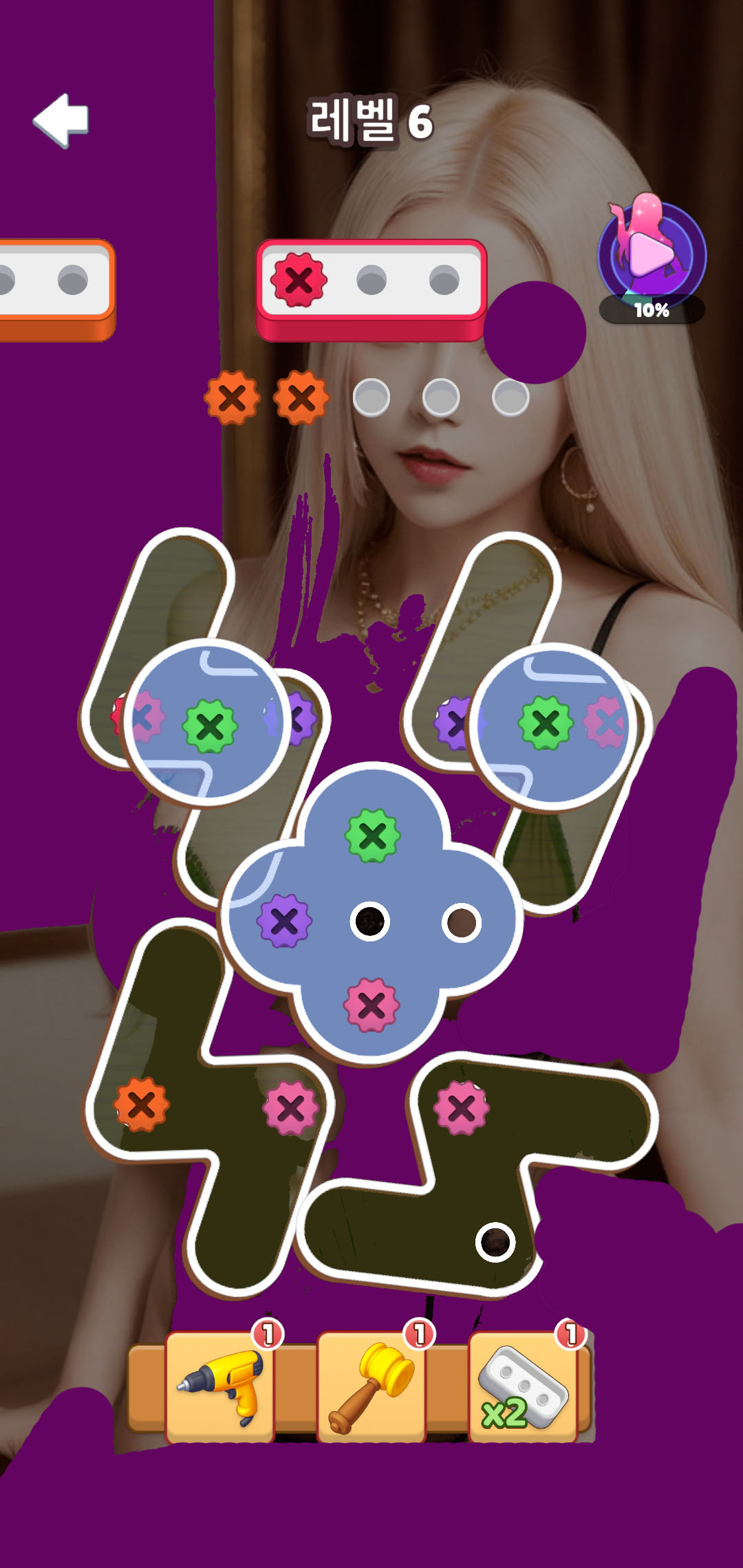 클리어하게 되면 보석을 받고 광고시청을 통해 몇 배 높은 보상을 받을 수 있다. 아래 번역이 '주장하기'라고 되어있는 것이 상당히 짜치긴 했지만 뭐... 애초에 퀄리티를 기대할 수 있는 건 아니니 상관 없고 게임 방식에 대해서 더 이야기를 해보자면 앞서 말했듯이 퍼즐의 기본 베이스 자체는 이미 많이 있는 유형이다. 다만, 나사가 박혀있다는 게 색다름이고 화면 상단에 보면 색상별 판이 있다. 저 판에 맞는 색상의 나사를 넣으면 된다. 노란색 판에 구멍이 4개 있으면 4개의 노란색 나사를 넣어주면 된다.