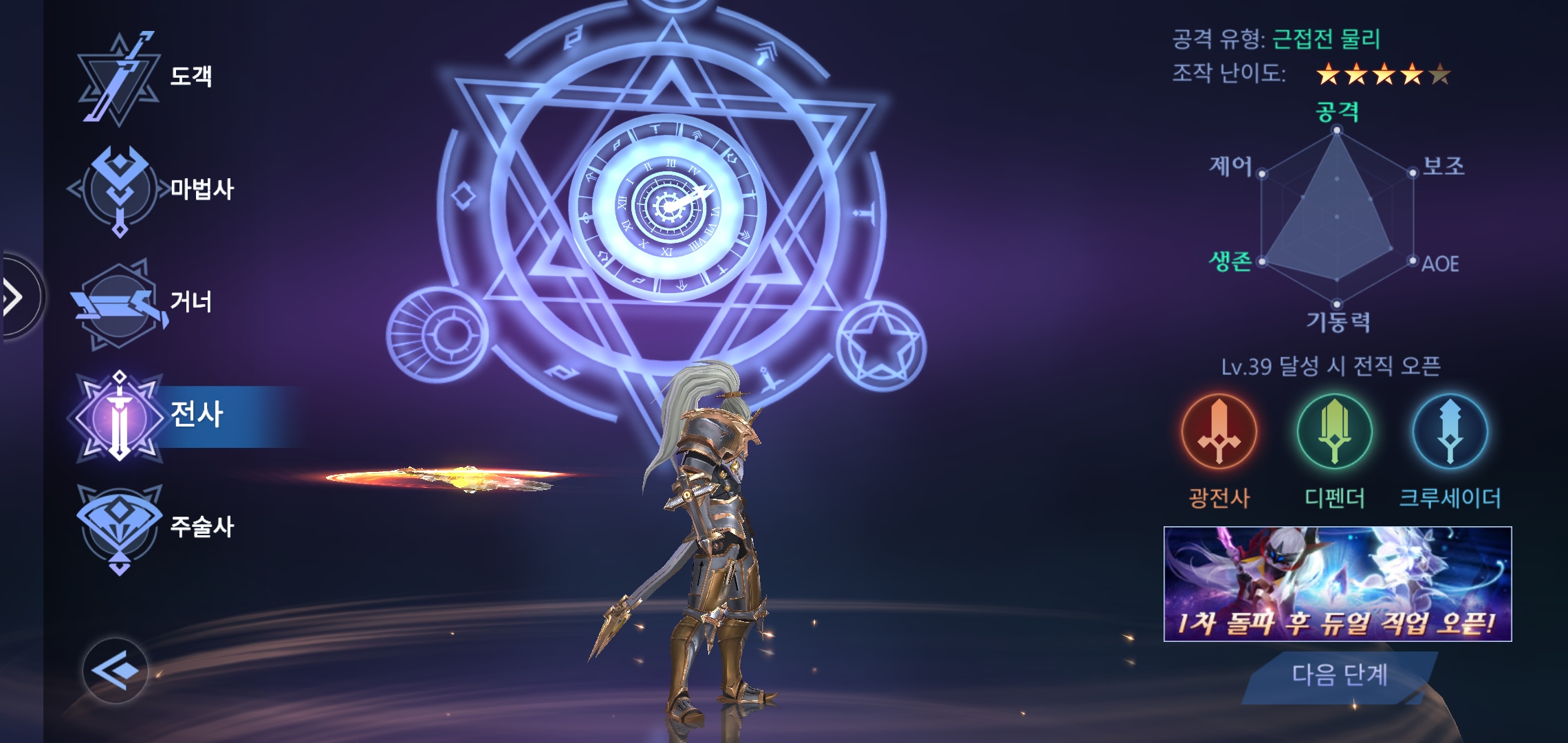 전사는 공격과 생존력이 좋은 물리 근접 직업이다. 기동력도 준수하다. 광전사, 디펜더, 크루세이더로 전직한다.
