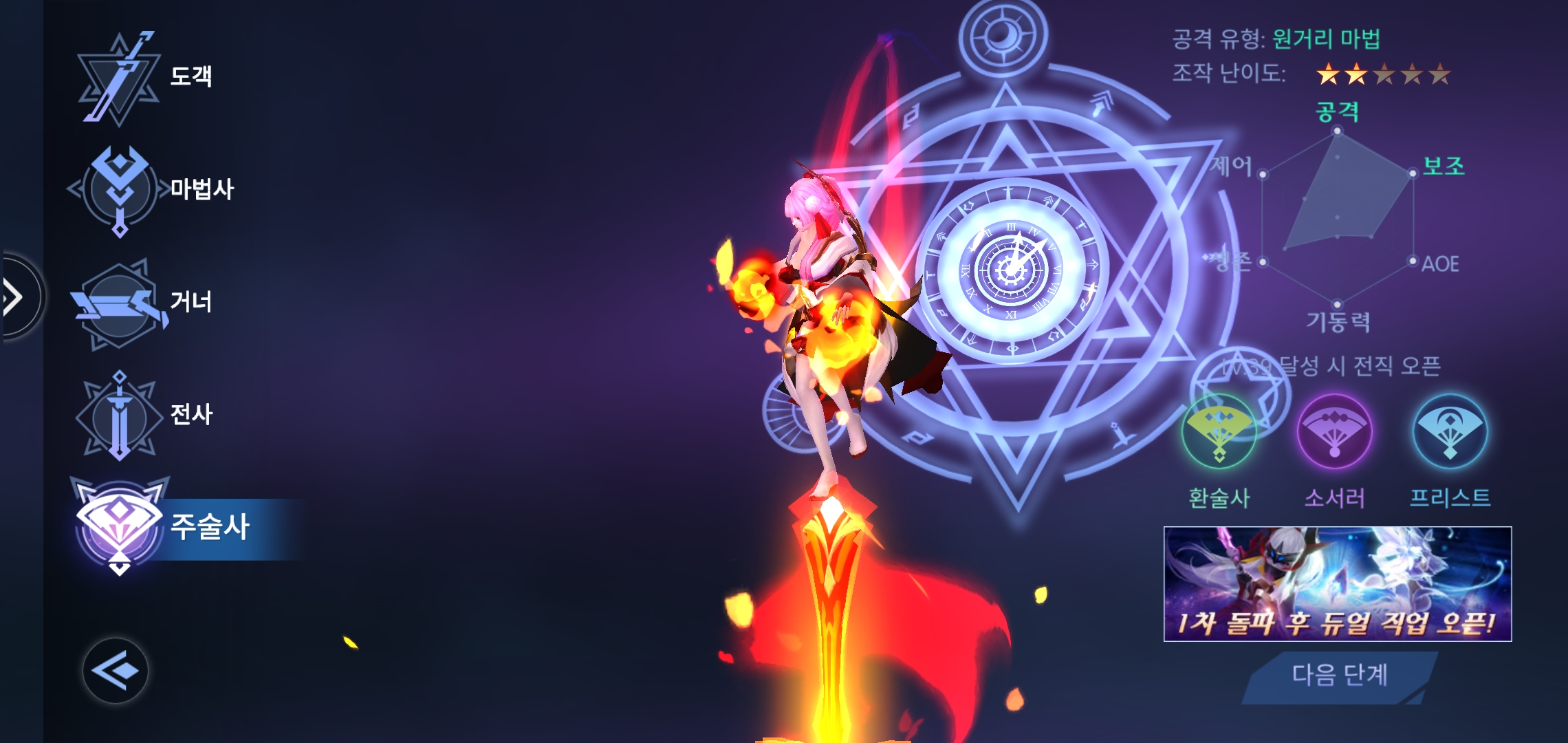 마지막 주술사는 공격과 보조가 맥스이고 생존력도 준수하다. 환술사, 소서러, 프리스트로 전직한다.