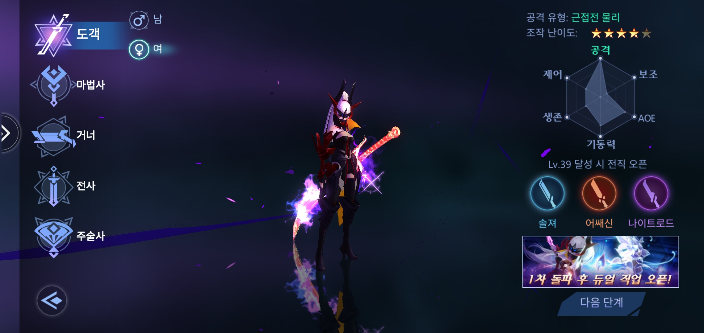 도객은 공격과 기동력 그리고 AOE가 높은데 AOE는 Area of Effect라고 해서 범위 효과 스킬을 말한다. 39레벨에 전직을 할 수 있는데 솔져, 어쌔신, 나이트로드로 전직할 수 있다.