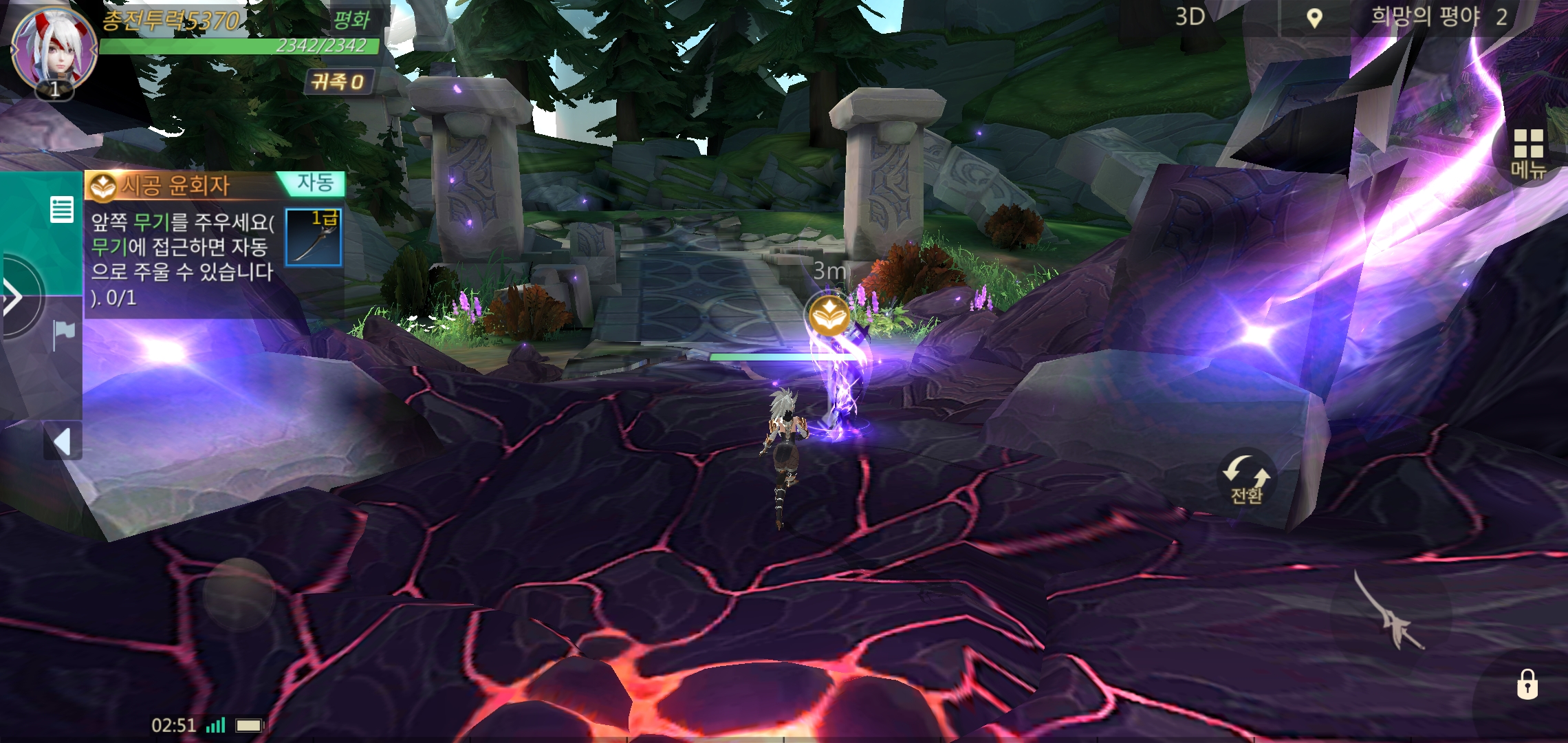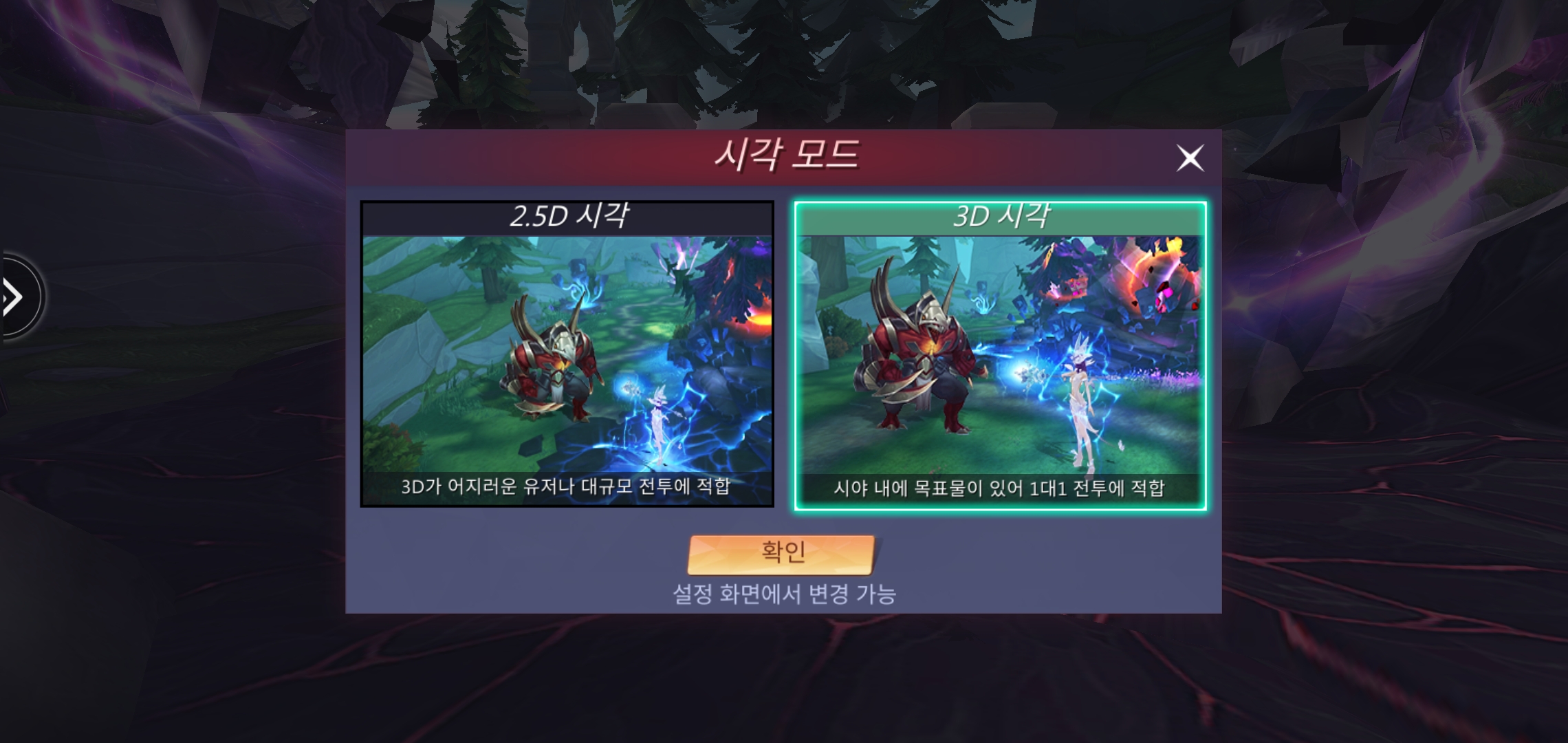 어차피 옵션에서 다시 선택할 수 있는데 처음에 2.5D시각과 3D시각 중에 선택할 수 있다. 3D 시각으로 해봤는데 생각보다 카메라 움직임도 좋고 3D로 할만 했다. 좀더 생동감이 느껴지고 3D시각이어도 피로감이 없어 좋았다.