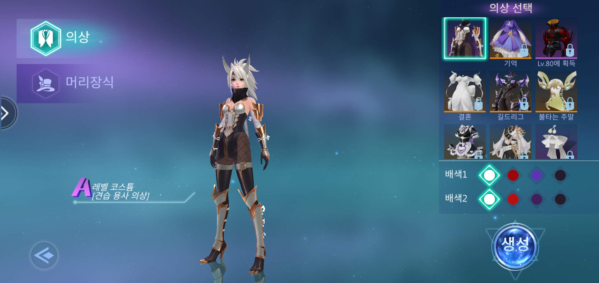 캐릭터 생성전 의상 선택과 머리장식 선택이 가능한데 배색만 바꿀 수 있고 나머지는 잠겨있다.