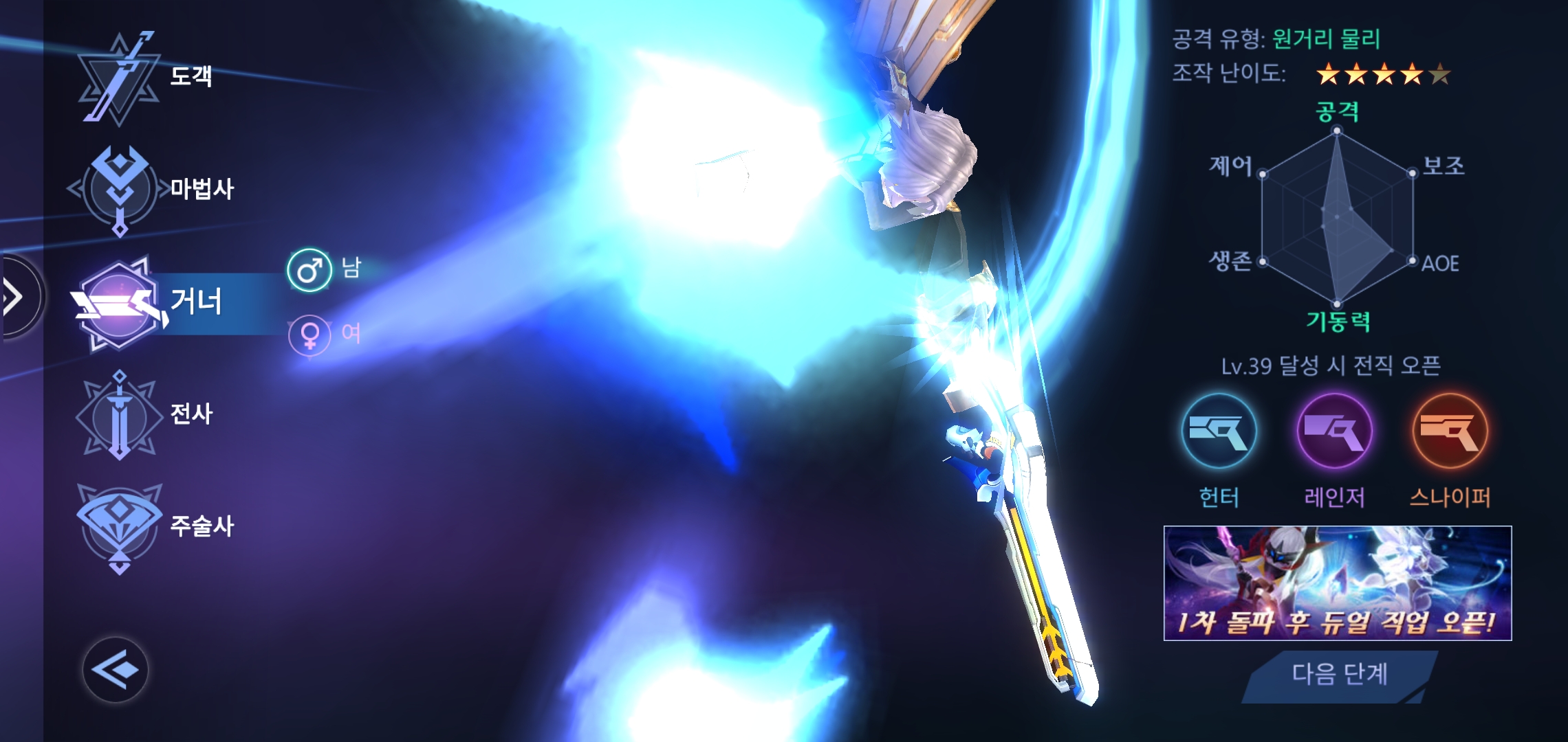 거너는 공격과 기동력이 맥스이고 AOE도 높다. 헌터, 레인저, 스나이퍼로 전직한다.