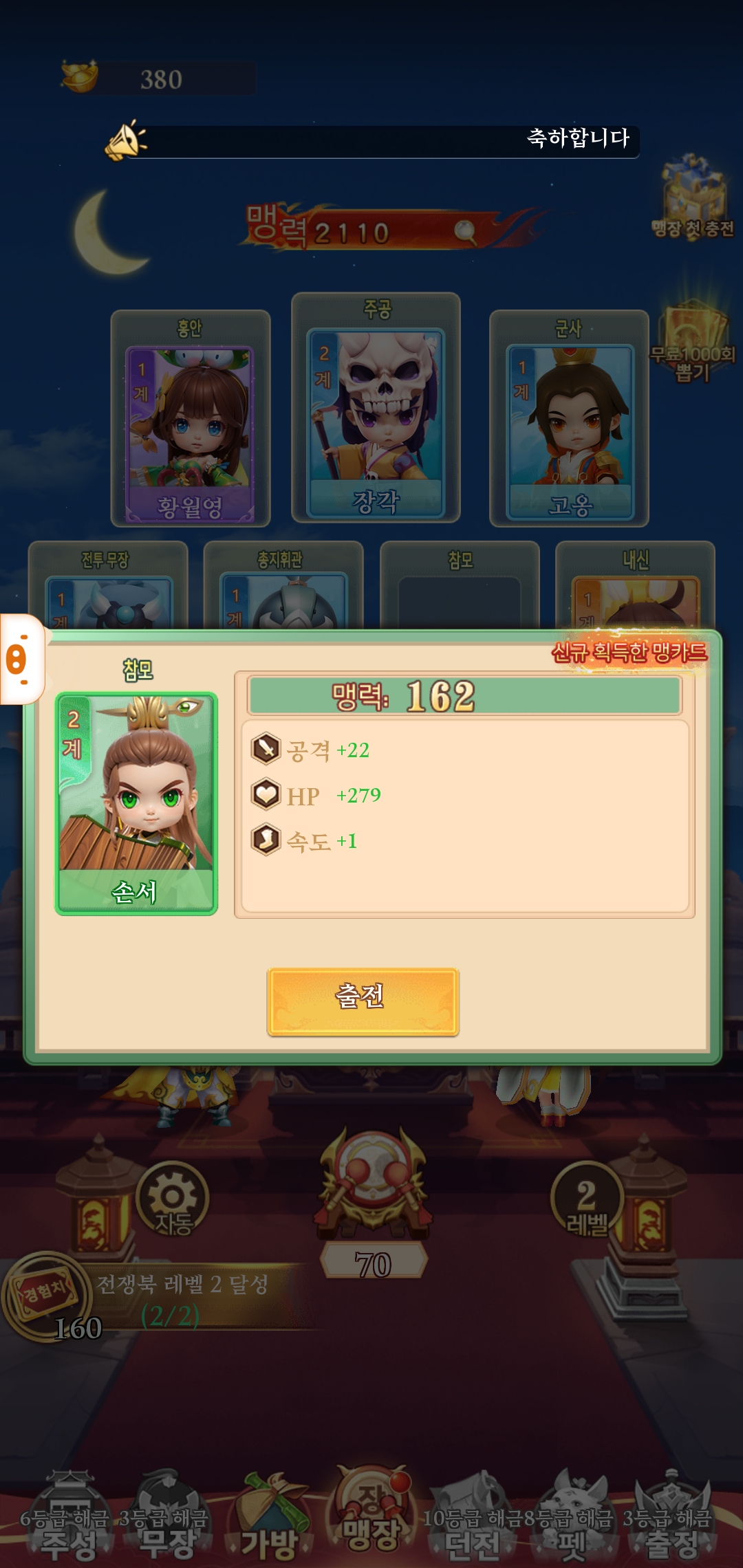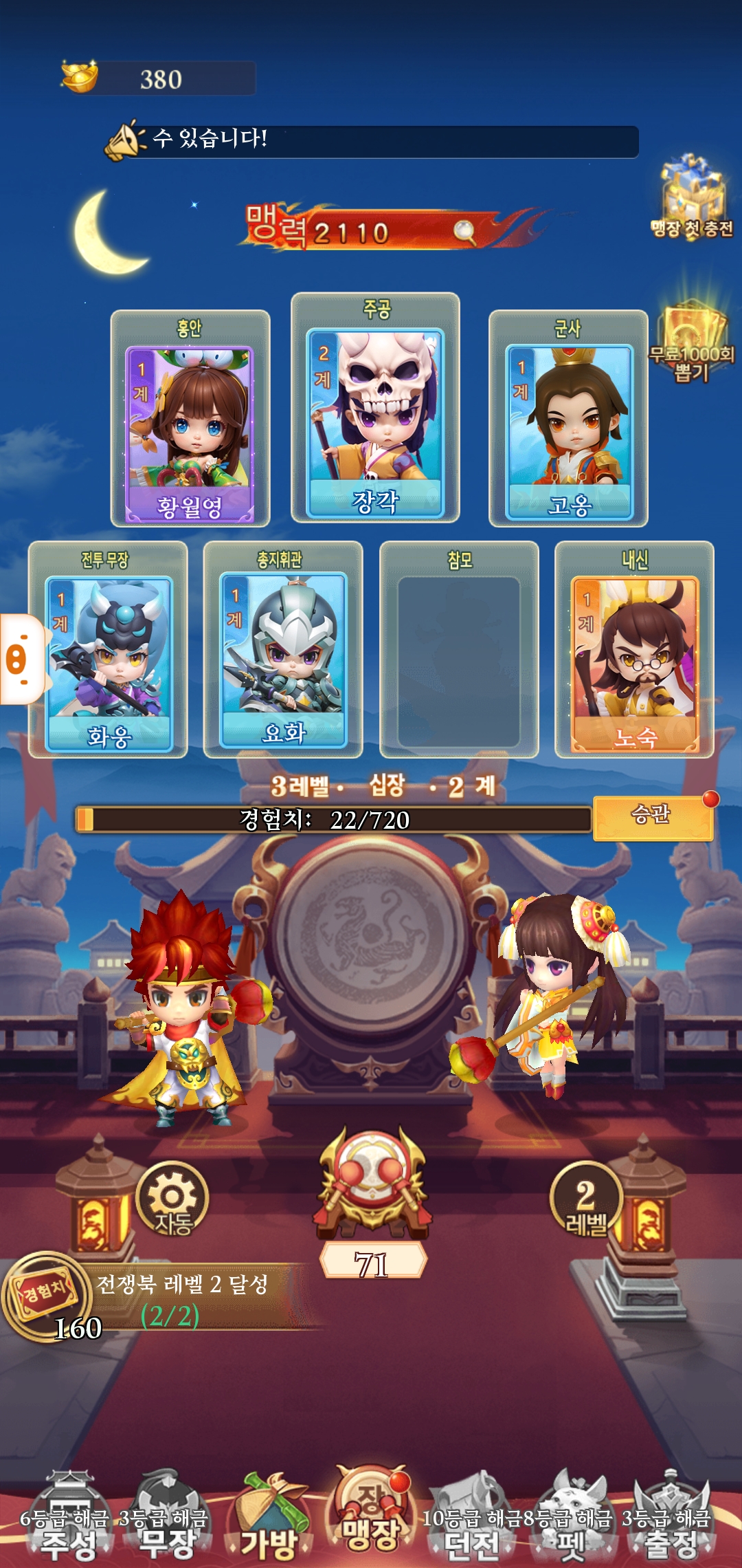 저렇게 홍안, 주공, 군사, 전투 무장, 총지휘관, 참모, 내신 등으로 나뉘어져있고 화면 하단 중앙에 보이는 전쟁북을 쳐서 무장을 계속 뽑아 나간다.