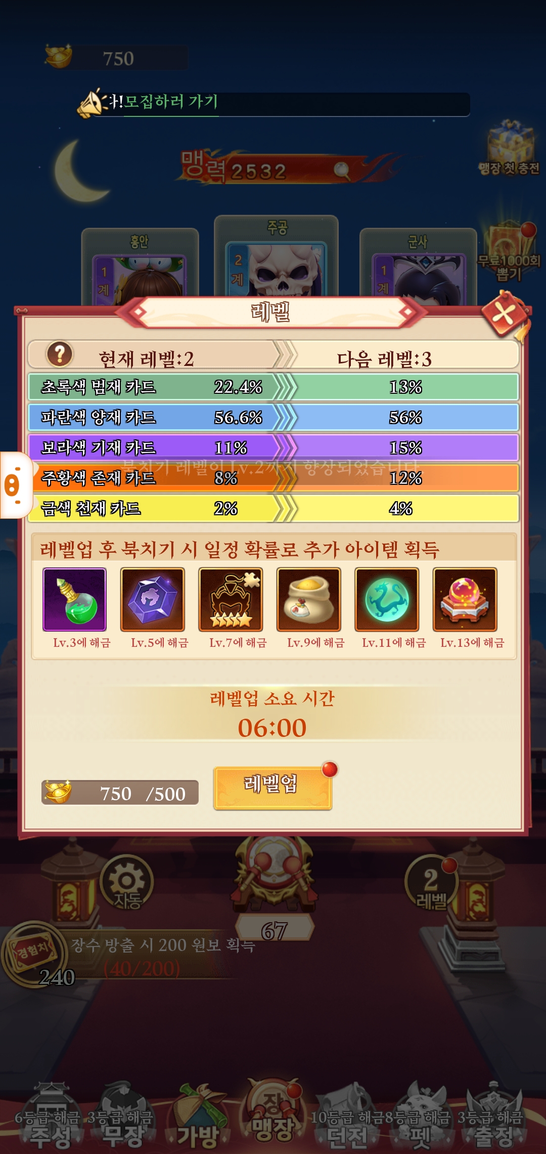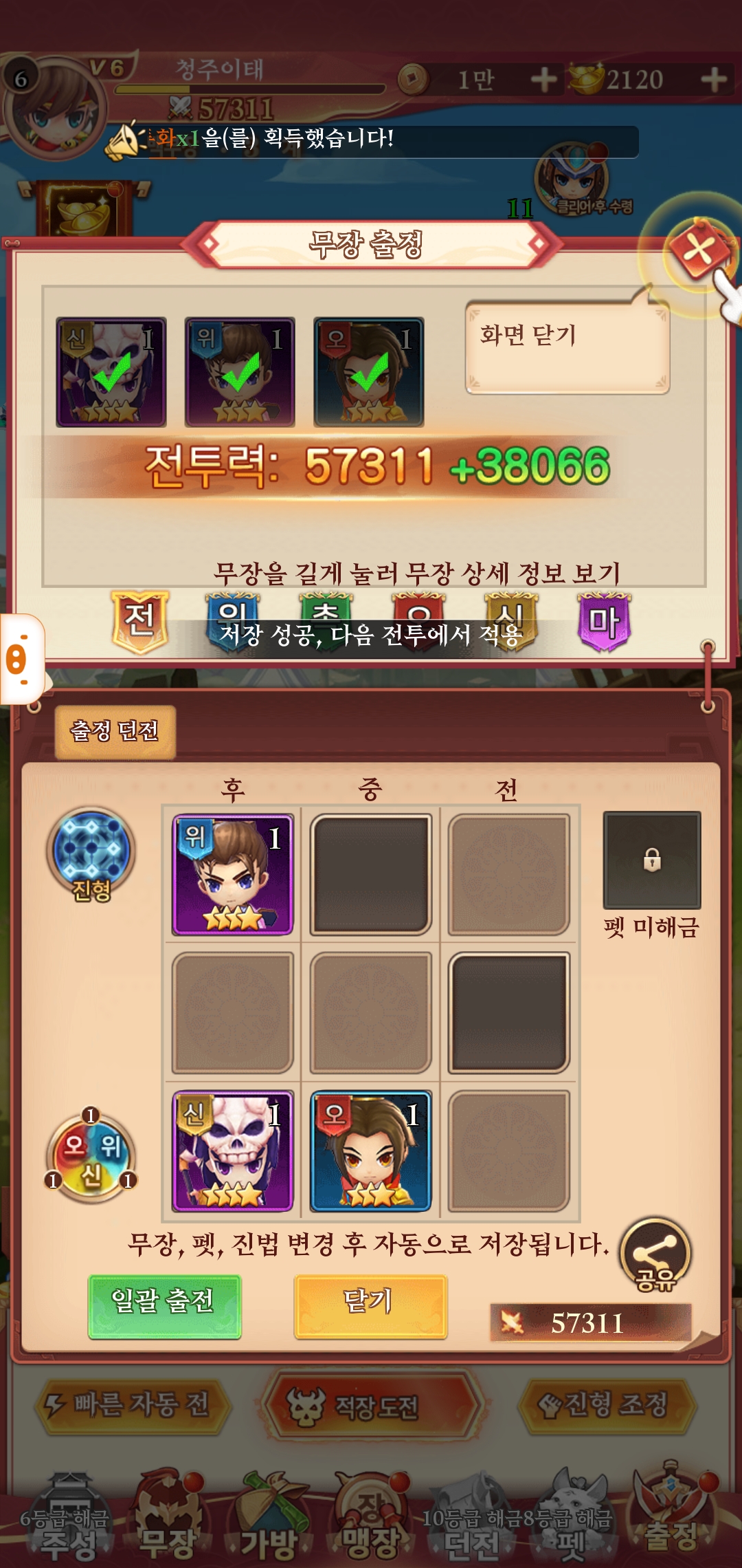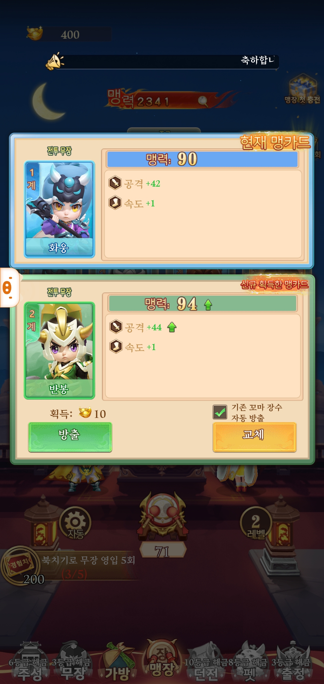 무장에는 등급이 있어서 등급이 높은 게 뜨면 교체하고 기존 카드는 방출시키면 된다. 방출하면 경험치를 얻는다. '기존 꼬마 장수 자동 방출' 체크 박스가 있기 때문에 체크해두면 교체할 때 자동으로 방출 해준다.