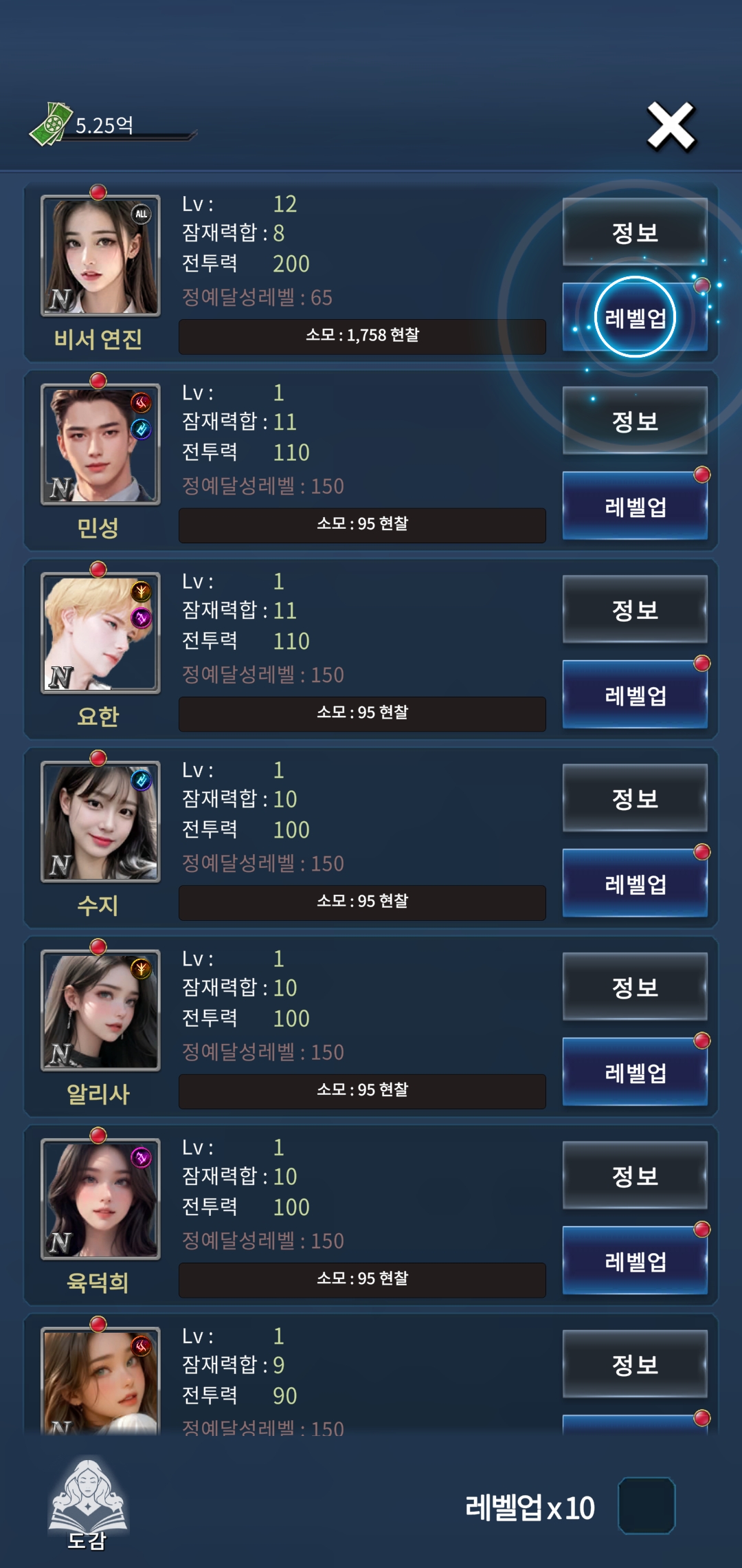 전투가 있어서 캐릭터들은 레벨업을 해줘야 하고 도감에서 얻지 못한 캐릭터들도 확인이 가능하다. 캐릭터는 많이 준비되어있었다.