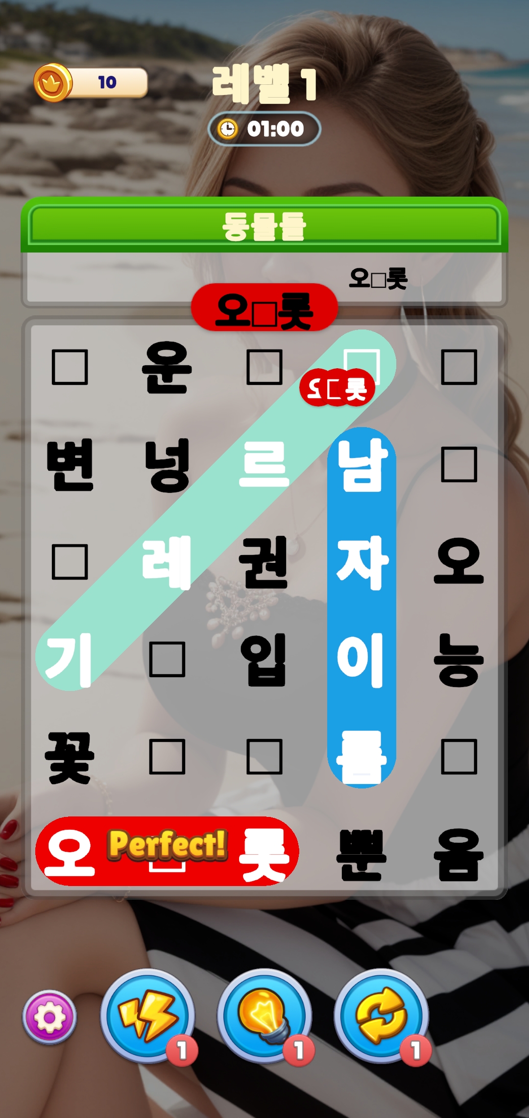 위 사진 보다시피 글자들이 화면에 나열되어있다. 상단에는 플레이어가 찾아서 드래그해야하는 글자들이 나와있고 이것들을 찾아서 아래 필드에서 터치 앤 드래그 해주면 된다.