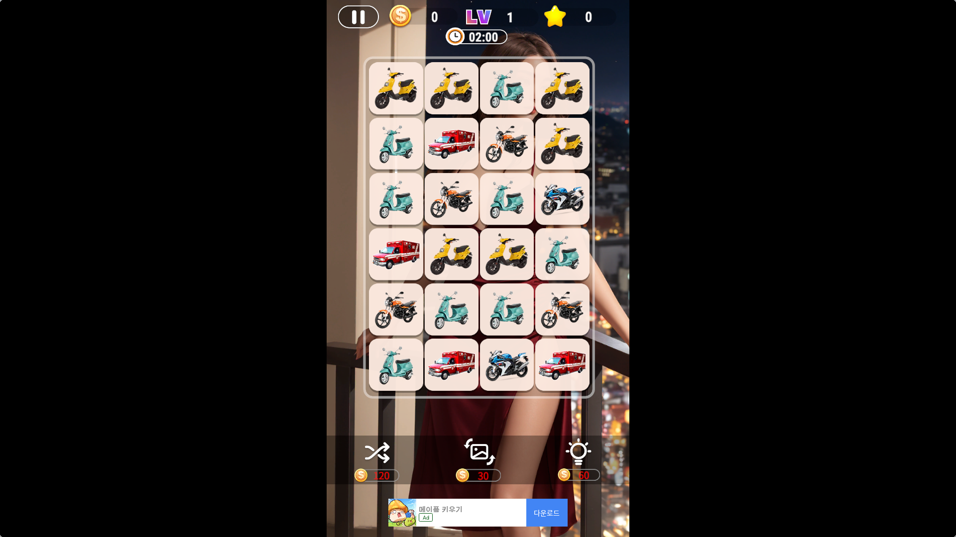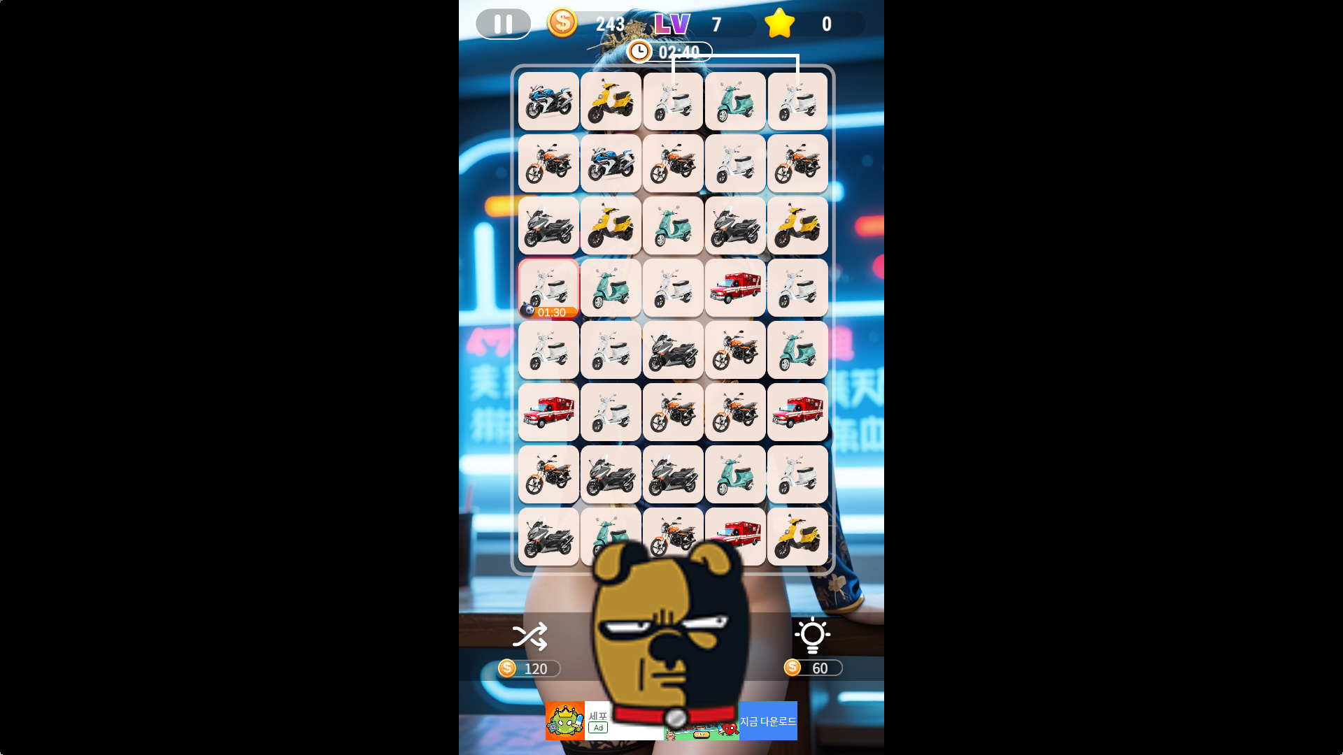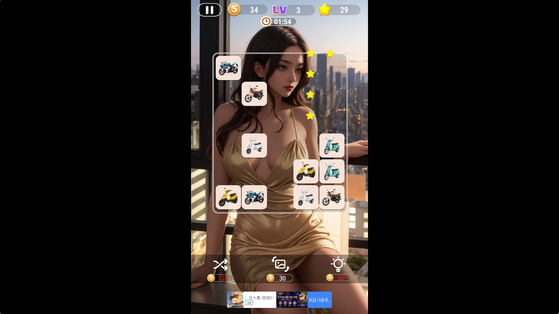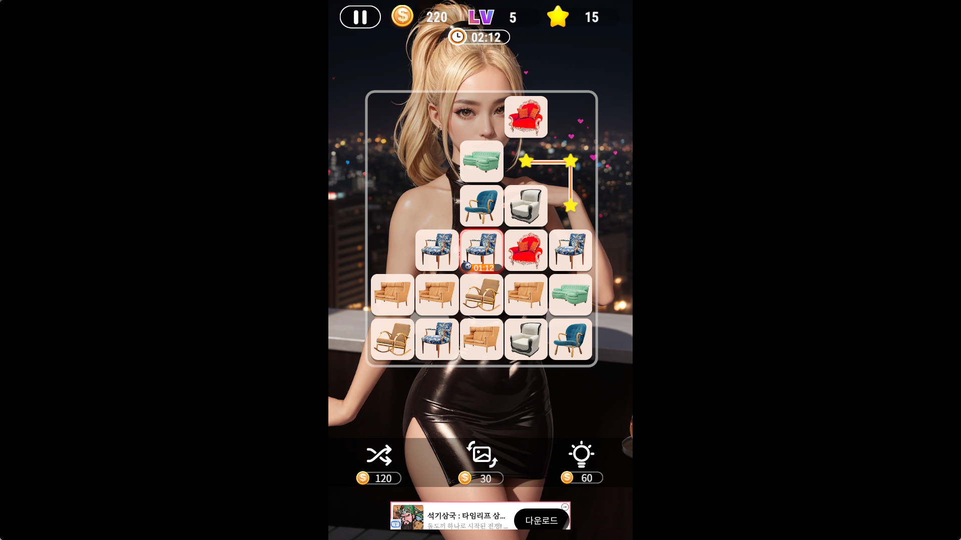 이런 식으로 타일 퍼즐이고 같은 그림끼리 맞춰서 없애주면 된다.