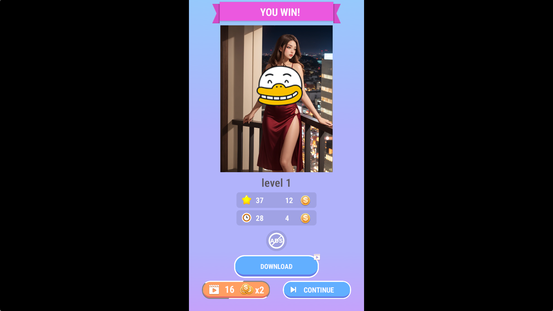 클리어를 하면 해당 스테이지 이미지의 전체를 볼 수 있고 광고시청시 추가적으로 다운로드도 가능하고 마찬가지로 광고시청을 하면 보상을 더 얻을 수 있다.