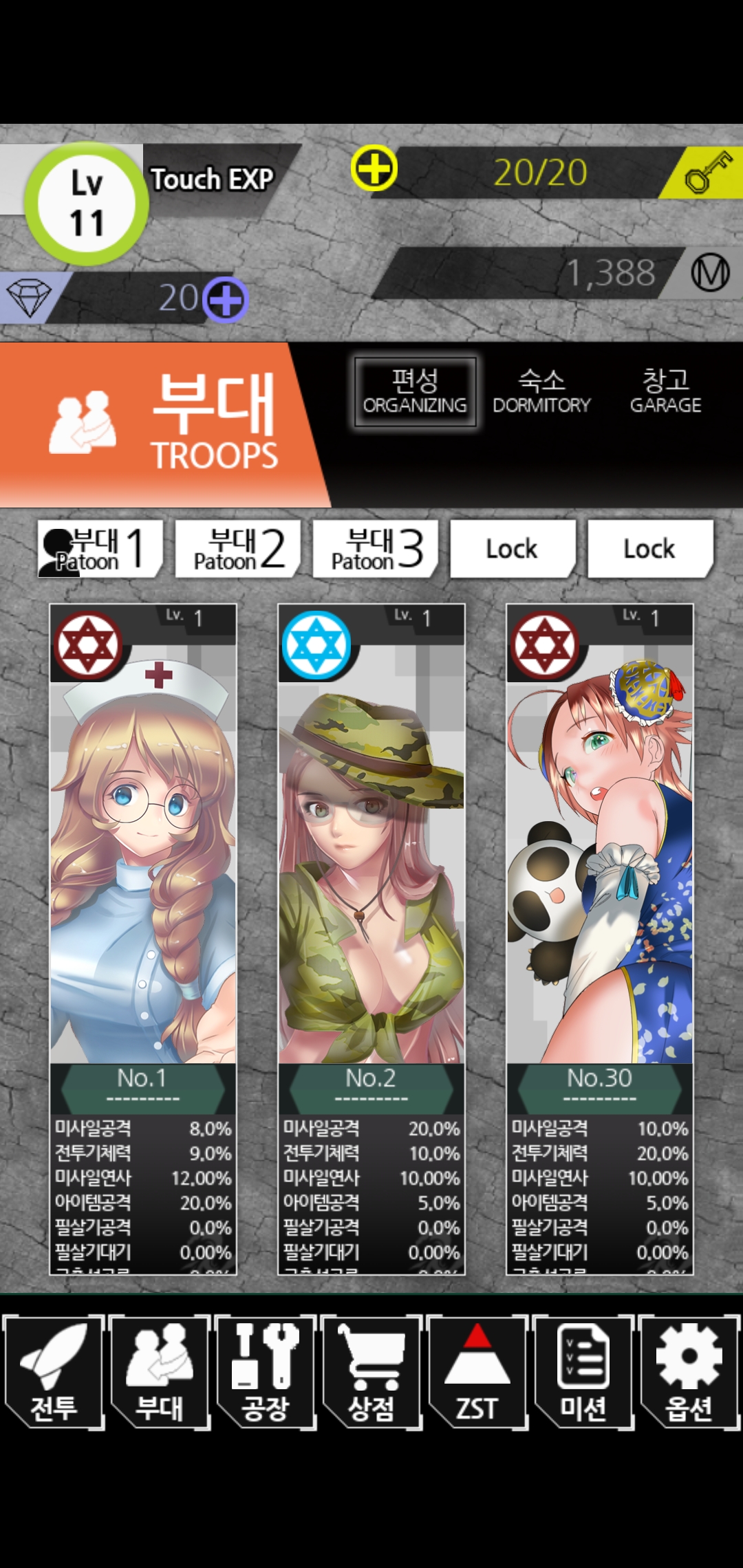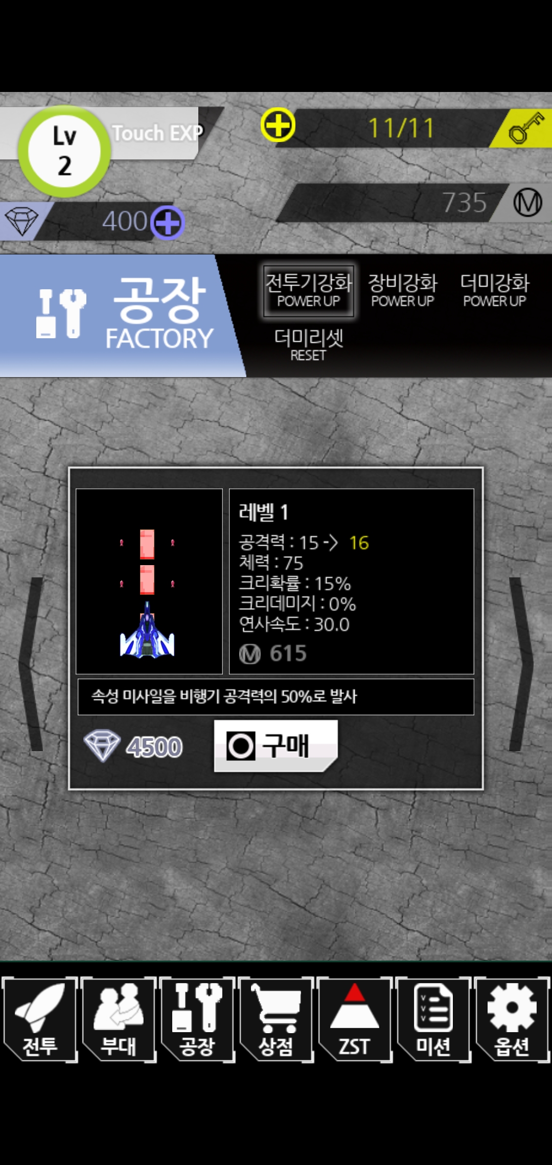 역시 확정이 좋은 게 확실하게 원하는 캐릭터를 구매할 수 있다 보니까 목적성이 확실해진다. 캐릭터 하나씩 모으는 재미가 더 살아난다. 물론 구매했다고 끝은 아니고 계속해서 다이아로 동일 캐릭터 구매해서 조각모음을 하고 레벨업 시켜줘야 한다. 전투기 강화는 앞서 말했듯이 머니로 업그레이드 가능하고 더 좋은 전투들은 다이아로 구매 가능하다.