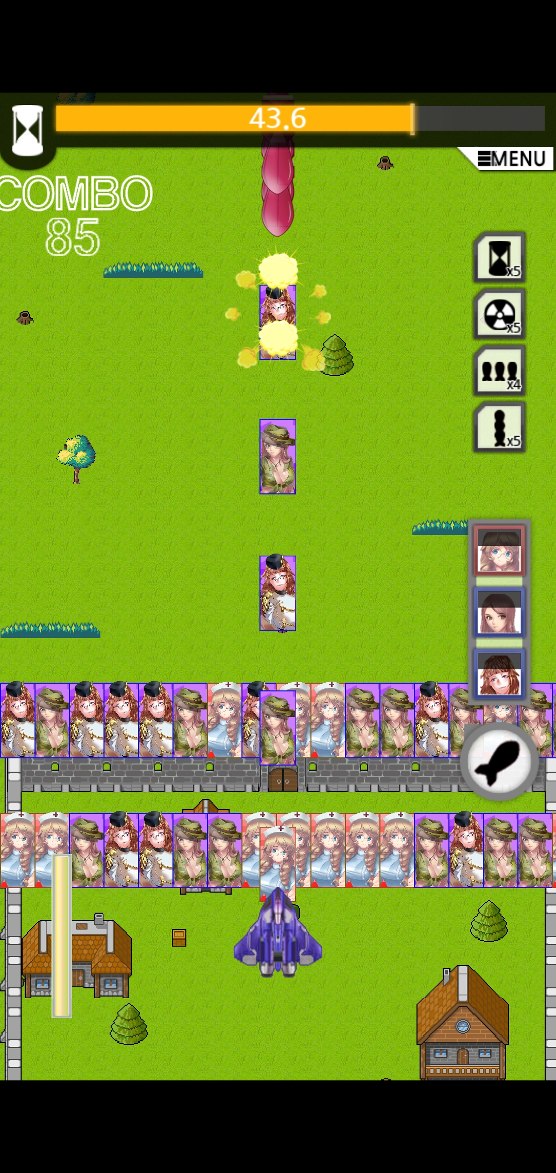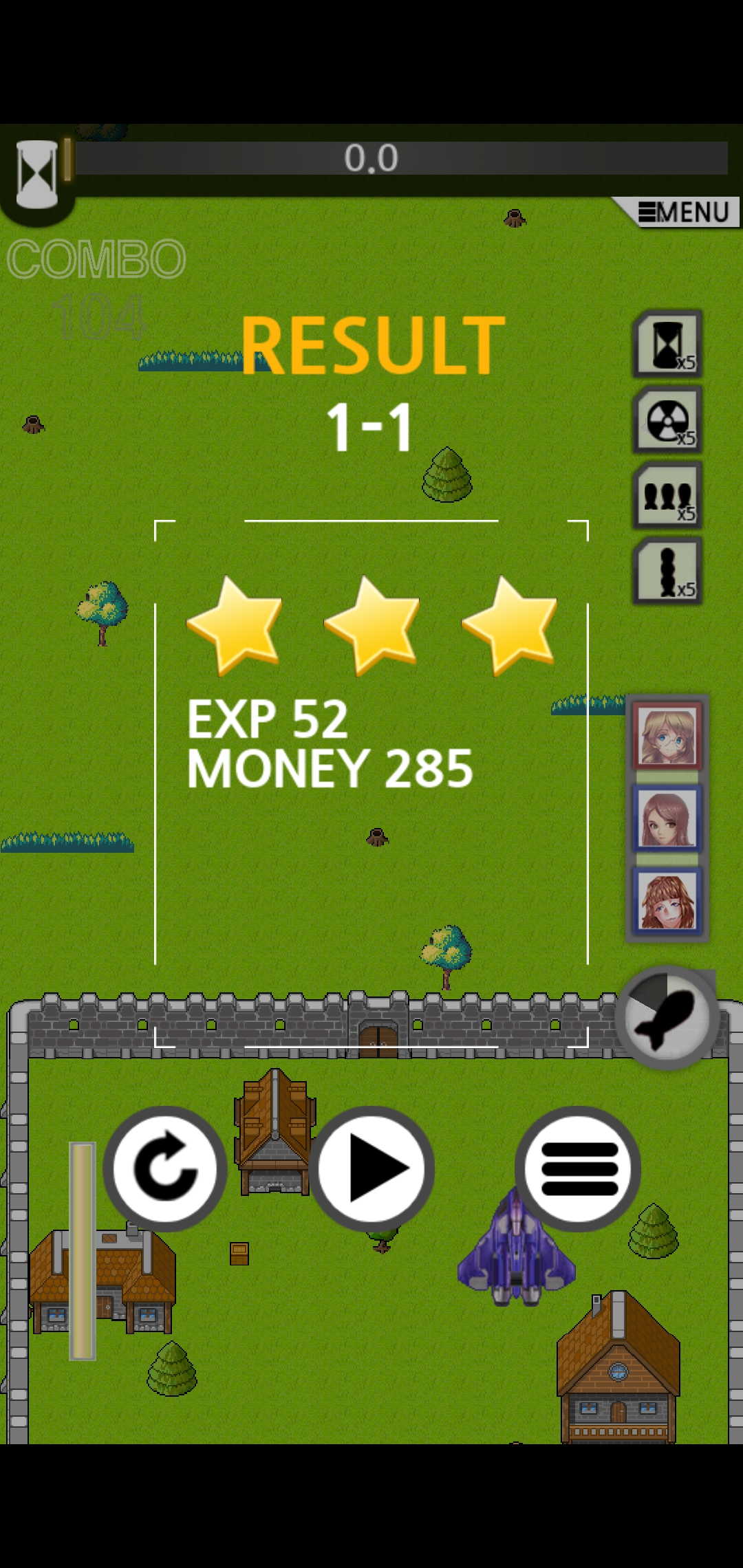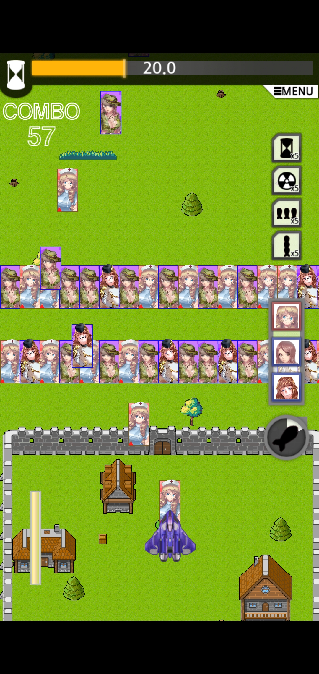 다 똑같은 매커니즘인데 전투기가 나오고 편성한 캐릭터들 카드가 발사된다. 방어는 내려오는 미사일들을 모두 파괴하면 되는데 놓치거나 전투기가 맞으면 HP가 소모된다. HP가 0이 되기 전까지는 게임오버되진 않지만 획득하는 별이 적어져서 보상을 덜 받는다. 전투의 핵심은 기본 스펙은 당연하고 적들 파괴했을 때 나오는 특수 공격들을 무조건 먹어야 한다. 밑으로 떨어지기 때문에 놓치지 말고 먹는 것이 좋고 오른쪽 사이드에 보면 위에서부터 소모템, 필살기, 부스터이다.