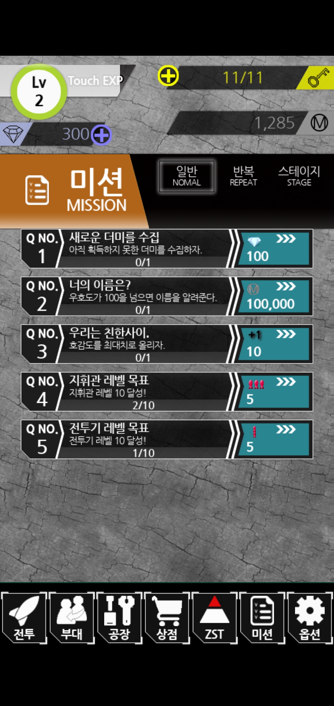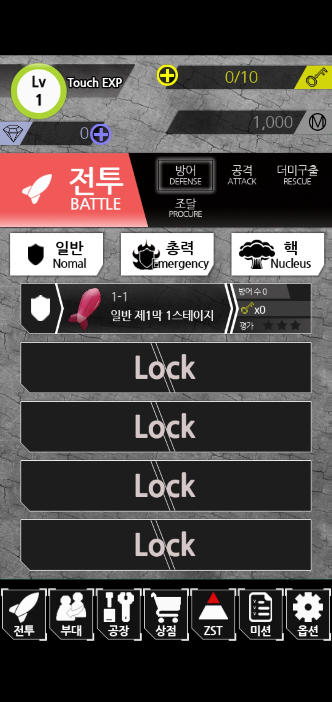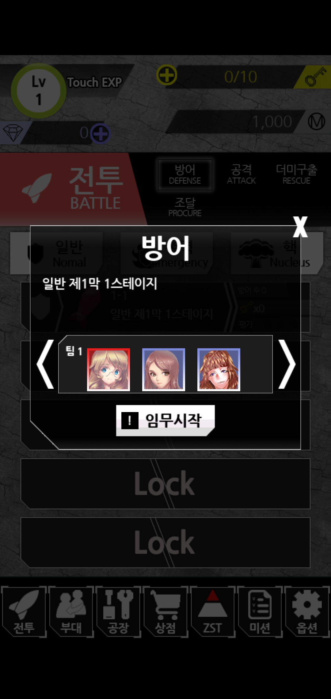 튜토리얼이 있기는 한데 스킵 가능하다. 바로 스킵해주고 본격적으로 플레이에 들어가면 되어서 좋았다. 딱히 설명을 들어야 하는 부분은 없어서 스킵해도 무관하다. 전투는 방어, 공격, 더미구출, 조달의 스테이지를 클리어해가면서 보상 받고 재화 모아서 캐릭터 구매하고 업그레이드 하는 모바일게임이다. 기본적으로는 방어 임무가 가장 난이도가 쉽다고 볼 수 있겠다. 가만히 서서 내려오는 적들을 모두 파괴하면 된다. 전투는 편성한 팀으로 임무시작을 한다.