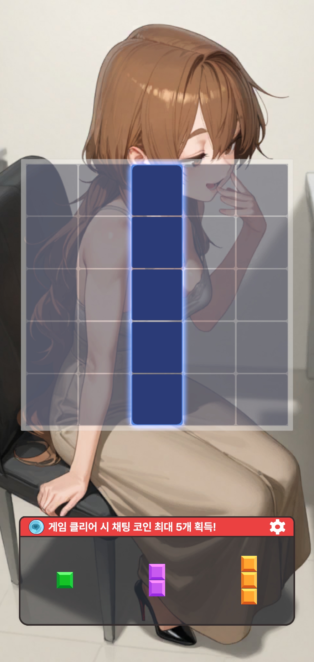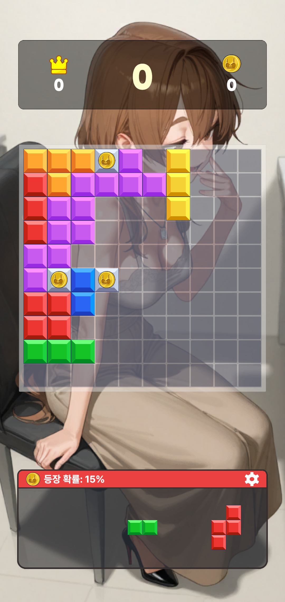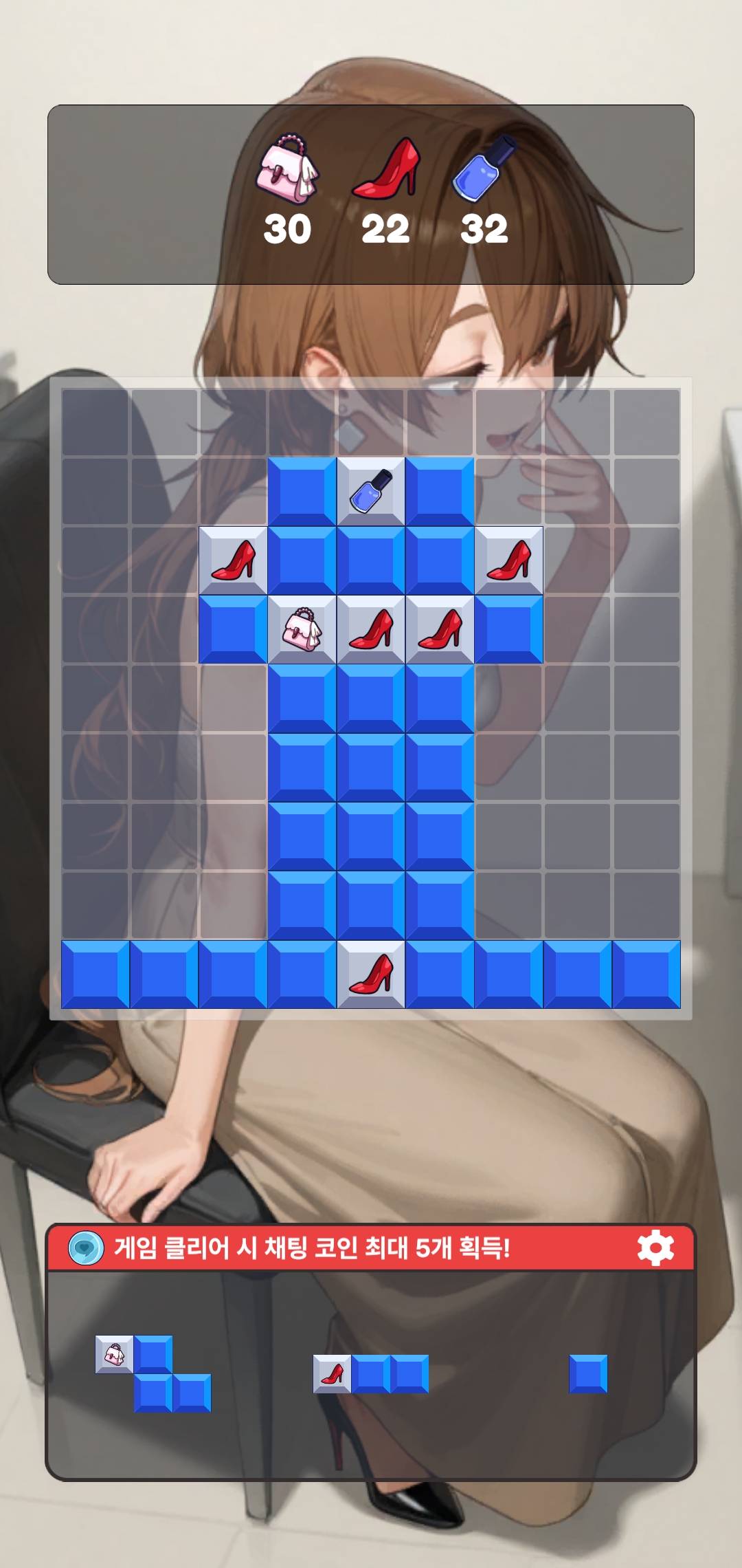 화면 하단부 오른쪽에 톱니바퀴를 누르면 다시 시작이나 종료를 할 수 있다. 보다시피 가방 30개, 구두 22개, 화장품 32개 이런 식으로 제거해야 하는 갯수가 있고 이걸 달성하면 클리어된다. 보상은 하단부에 나와있다. 퍼즐이 어렵진 않은데 상당히 노가다성이 짙다. 쉽다고 대충 하면 막히게 되어 게임오버가 되기 때문에 신경써서 맞춰야 하는데 모아야 하는 아이템의 수가 워낙 많아서 상당히 인내심을 자극한다. 미니게임도 다를 건 없다. 게임 방식은 똑같은데 미니게임의 경우는 수집게임처럼 목표가 있는 게 아니고 스코어게임으로 등장 확률 15%를 가진 코인 블럭이 나오면 그걸 제거해서 코인을 얻을 수 있는 만큼 얻는 방식이다. 마찬가지로 블럭을 놓을 수 없는 상황이 되면 게임오버된다. 일러스트가 잘 뽑히긴 했어서 수집욕구는 일어나는데 퍼즐 게임이 상당히 노가다성이 짙어서 사실상 광고시청이나 과금으로 일러스트를 수집해야 한다고 볼 수 있겠다.