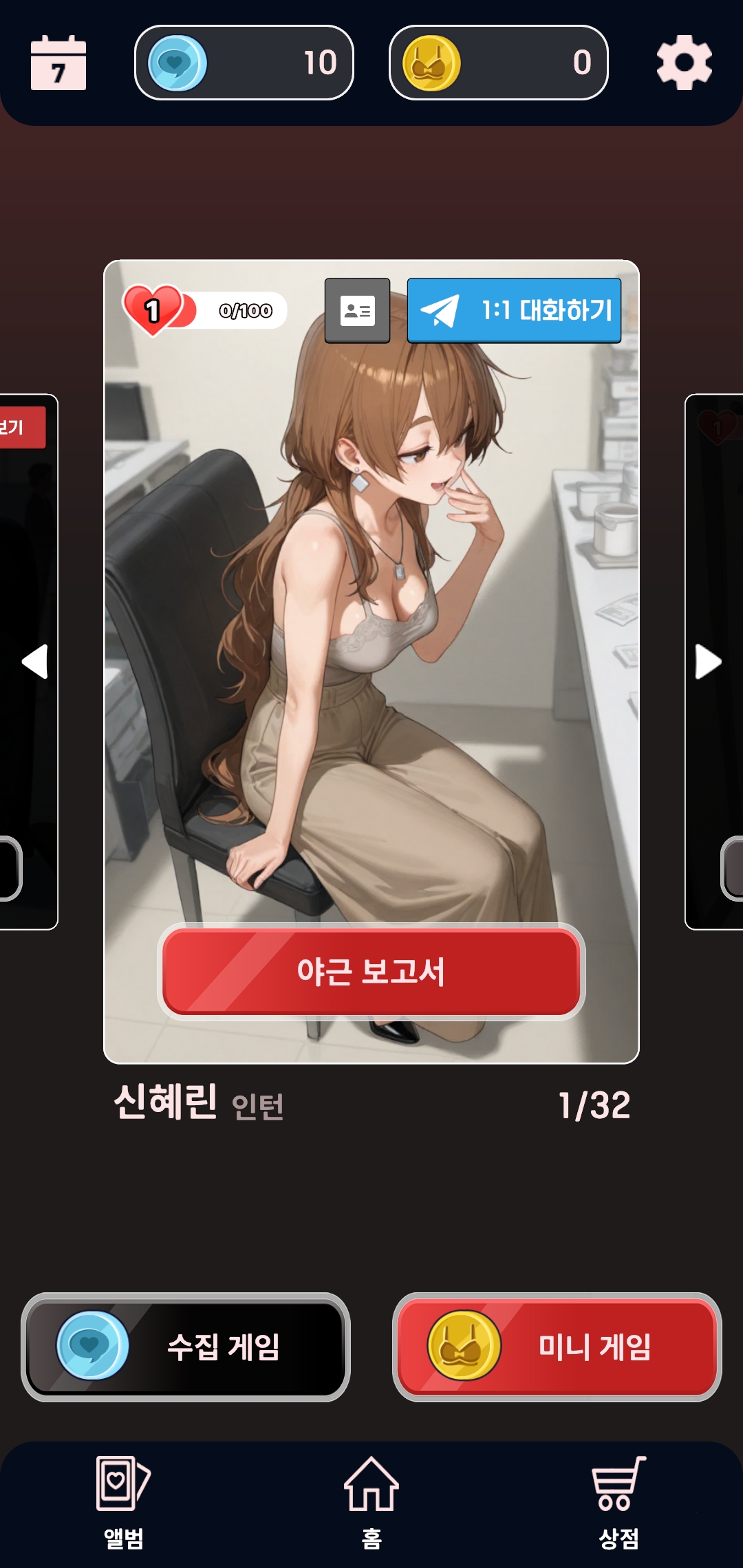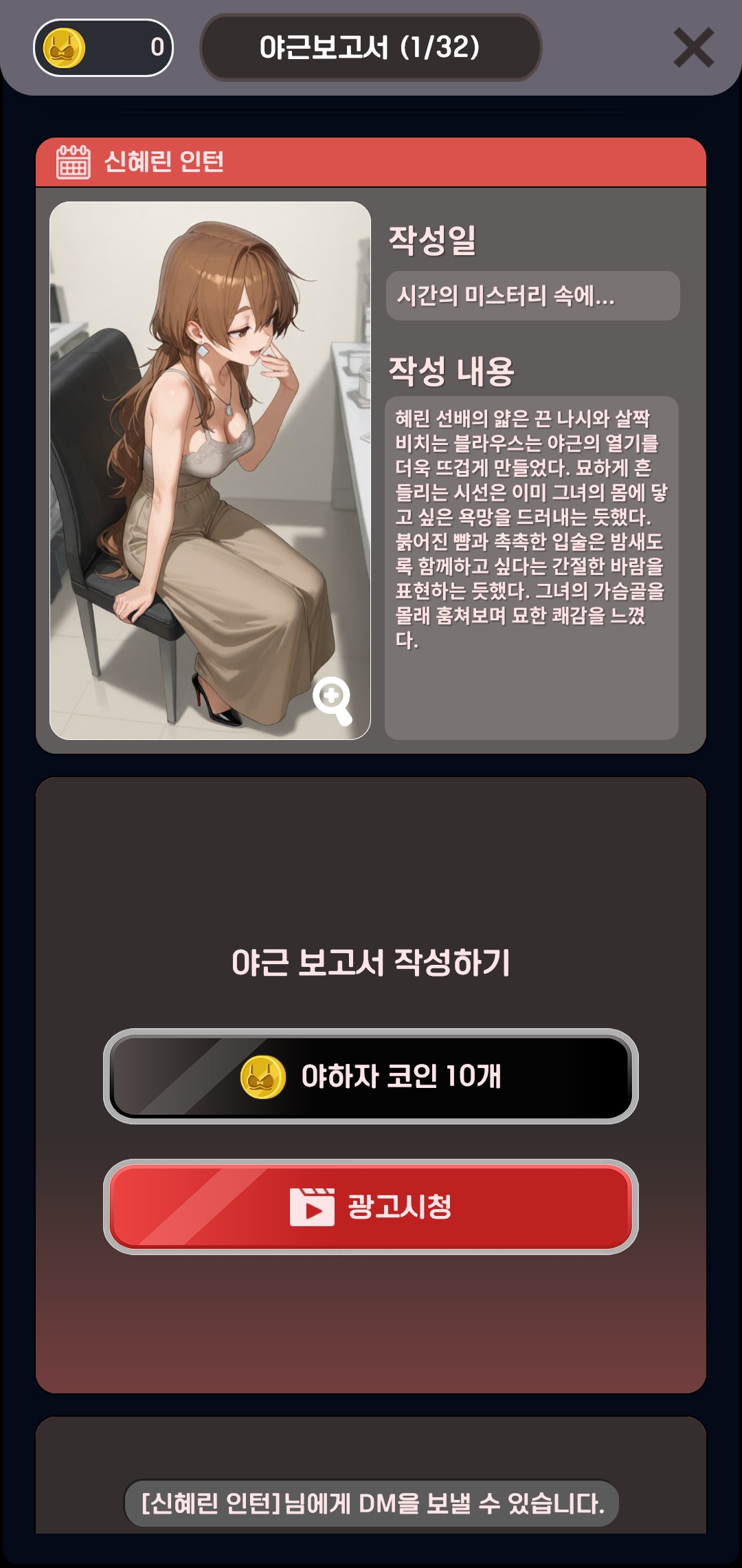 야근 보고서 작성을 위해서는 코인이 필요하다. 광고시청으로 해결할 수 있는 부분들이 많다. 기본으로 열려있는 야근보고서를 보게 되면 나름 뭐 내용이 적혀있다. 캐릭터의 프로필을 보게 되면 나이나 신체 사이즈 등등이 나와있다.