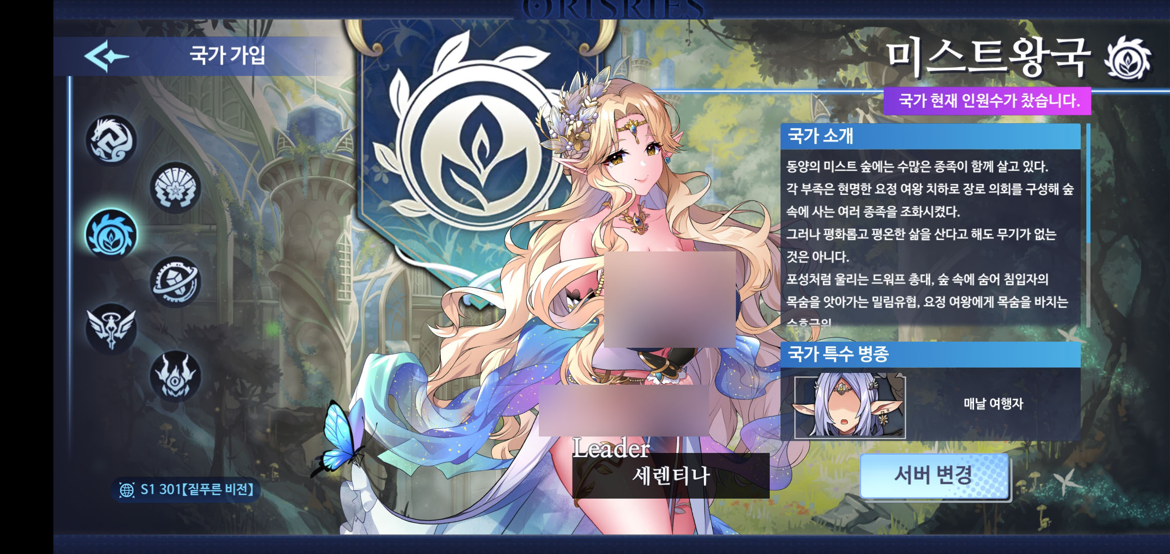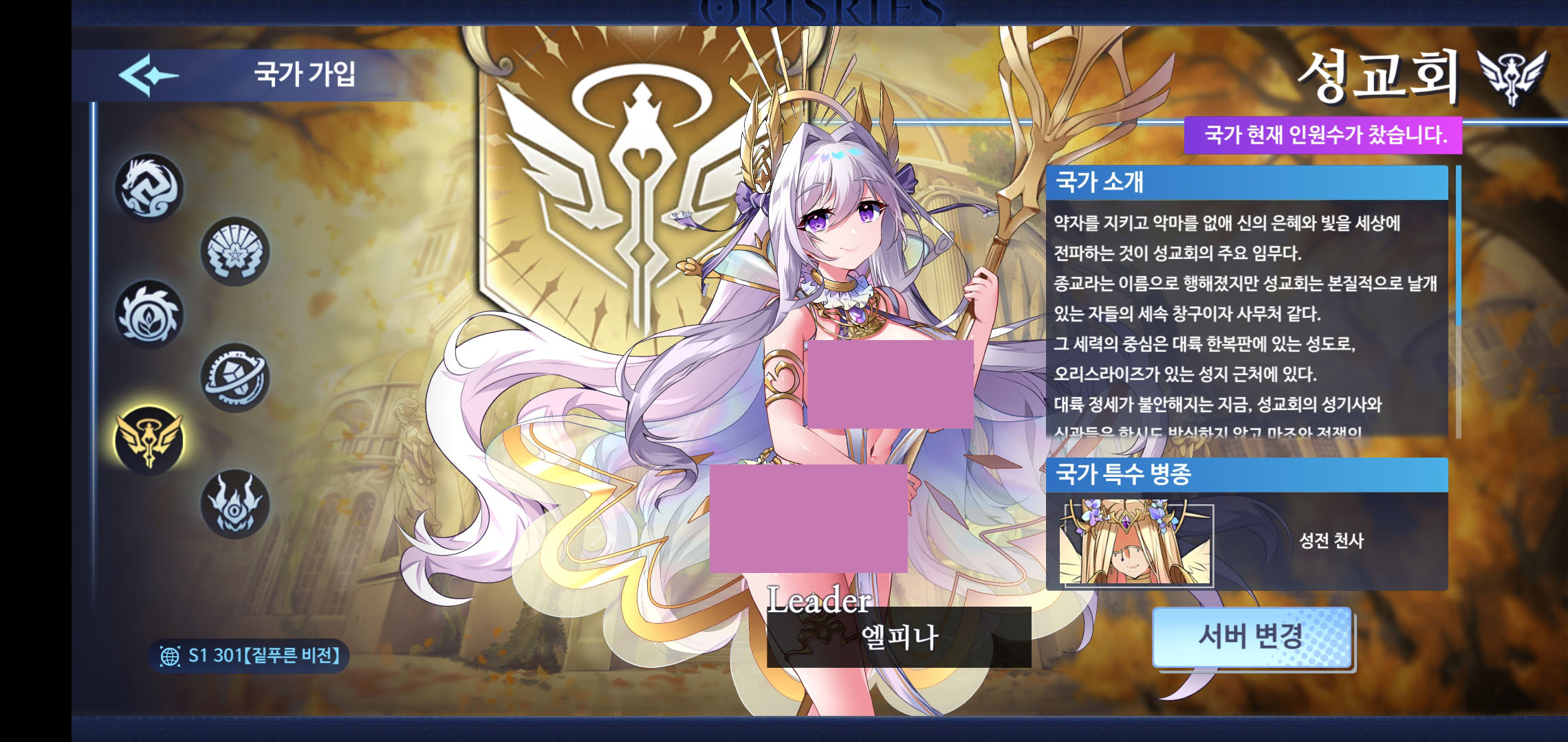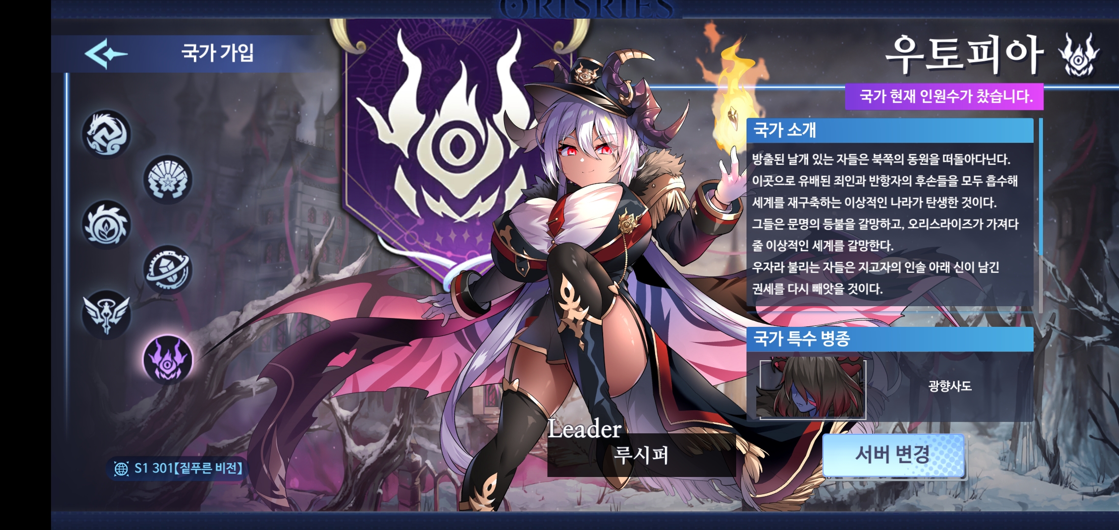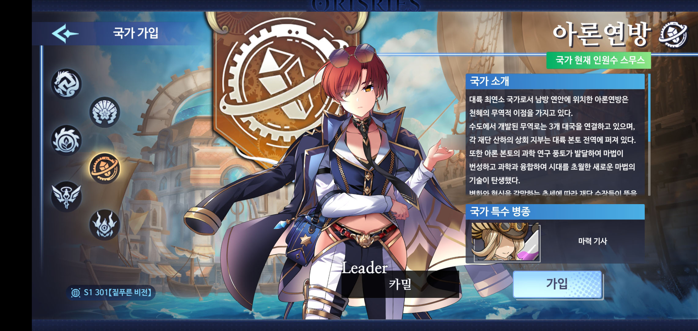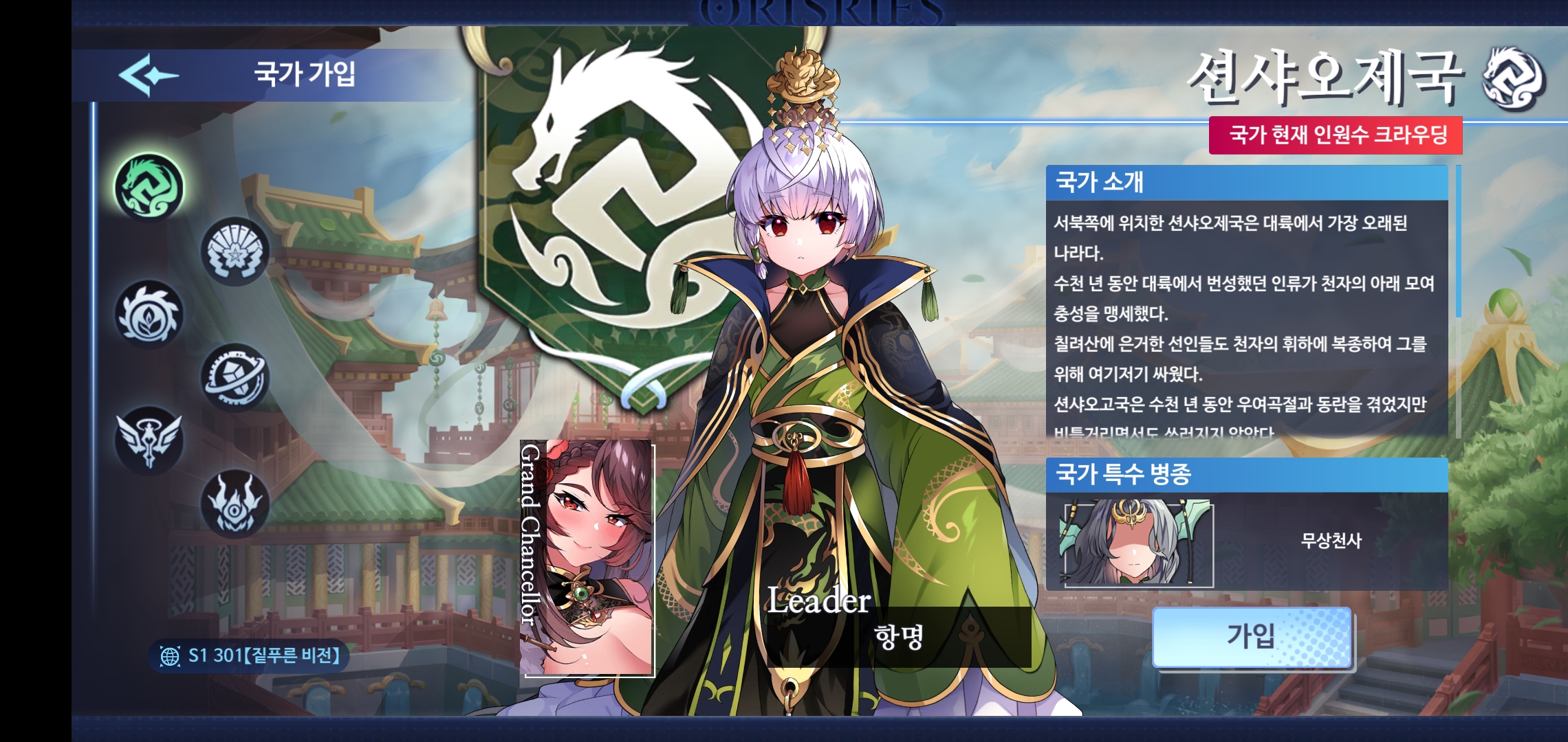 국가 가입은 처음에 선택해야 하는 요소로 총 6개의 국가가 있다. 션샤오제국, 이즈모국, 미스트왕국, 아론연방, 성교회, 우토피아가 있다. 이미지를 보니까... 왜 아론연방만 널널한지 알 것 같다. 물론 자세한 내용은 모른다. 다른 이유가 있는 것인지 뭔지는 모르겠다. 유독 아론연방만 과하지 않은 캐릭터가 있어서 그렇다. 그냥 아론연방 선택하려다가 션샤오제국 생성할 수 있어서 션샤오제국 선택했다.