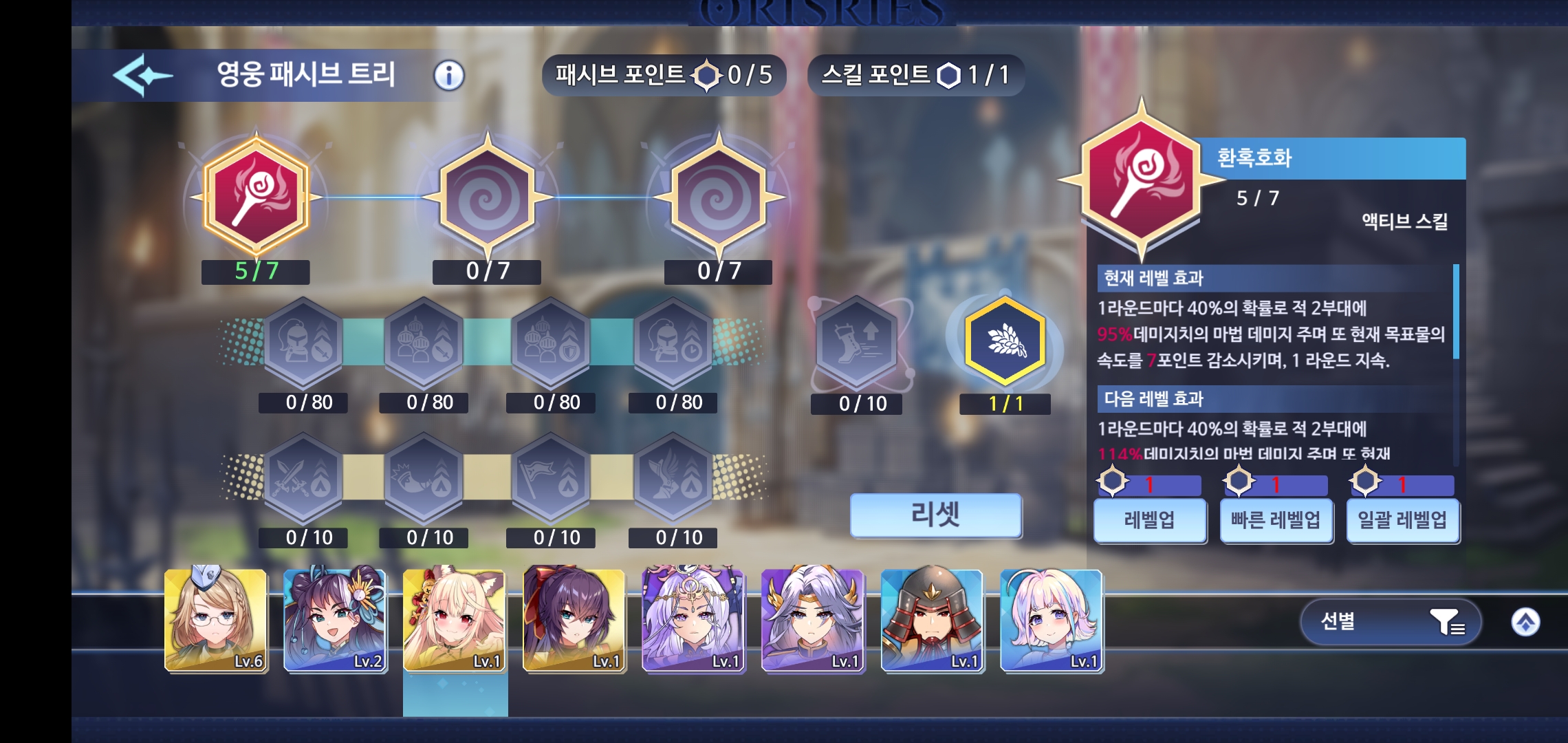 영웅마다 패시브 트리가 있고 레벨업을 하면 얻는 패시브 포인트와 스킬 포인트를 직접 분배해서 세팅할 수 있었다. 캐릭터들은 많은 것 같아서 일러스트 감상하면서 전략 시뮬레이션을 즐기는 게임이었다.