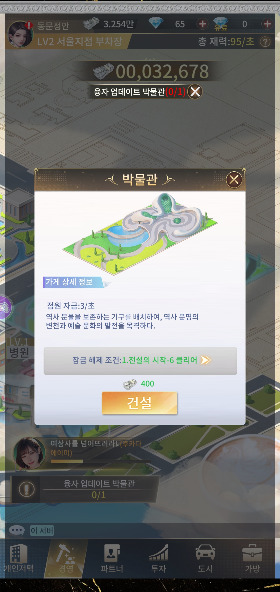 건설 자체도 뭐 여러 종류의 재화를 모아서 지어야한다던가 그런 게 아니기 때문에 플레이어가 하는 만큼 빠르게 모아서 건설하는 식이라 귀찮게 꼬아놓지 않았다. 파트너들은 파트너 육성에서 레벨업을 시켜줘야 하고 따로 뽑기도 필요하지만 퀘스트 진행하면서 보급되는 파트너들이 있다. 파트너 디자인은 보급되는 것 말고는 좀 개연성 없는 느낌이긴 하지만 어차피 뭐 큰 기대를 하고 플레이하는 게임은 아니라서 짜치긴 해도 나쁘진 않았다.