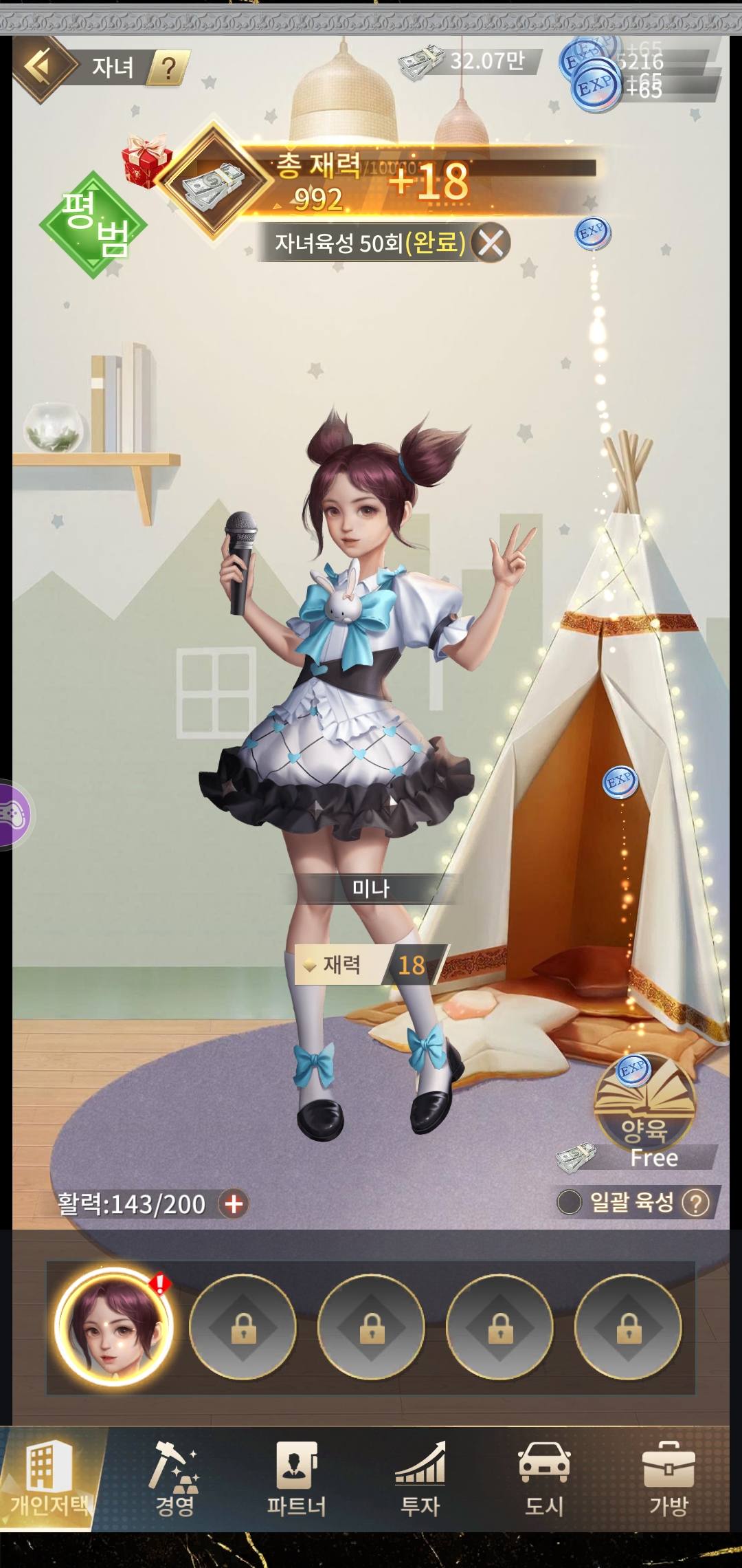 결혼해서 아이를 낳아 육성하는 건 정말 어이가 없긴 했는데 나름 또 아기 모습에서 부터 성인이 되기까지 성장하는 이미지를 만들어놨다. 별 건 없고 그냥 양육 버튼만 눌러서 레벨업시켜주면 되었다.
