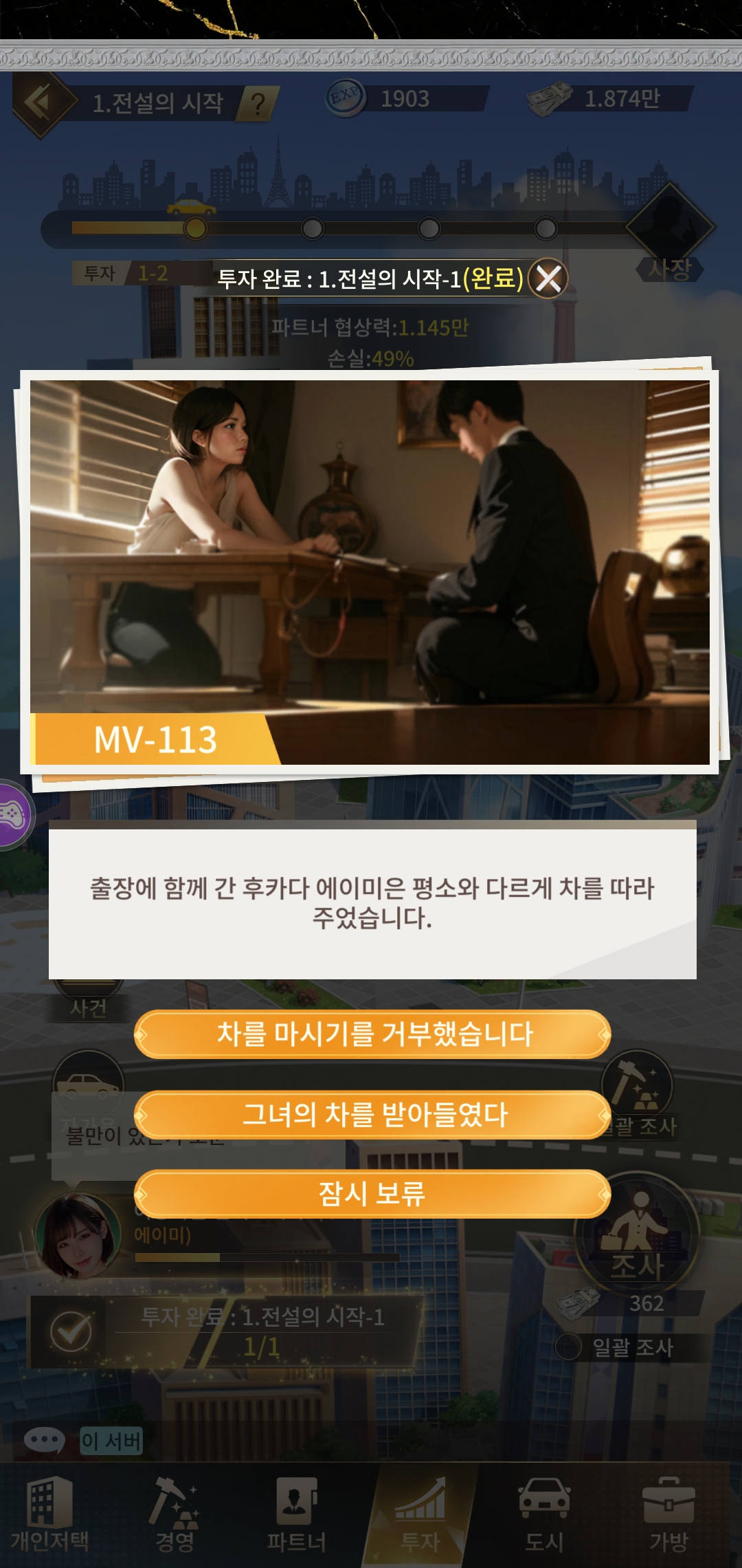 조사 같은 것도 일괄 조사 기능도 있긴 하지만 그냥 눌러도 불필요한 애니메이션 없이 빠르게 진행되어서 경영 시뮬레이션이란 장르에 비해서 피로감이 아주 적은 게 특징인 게임이다.