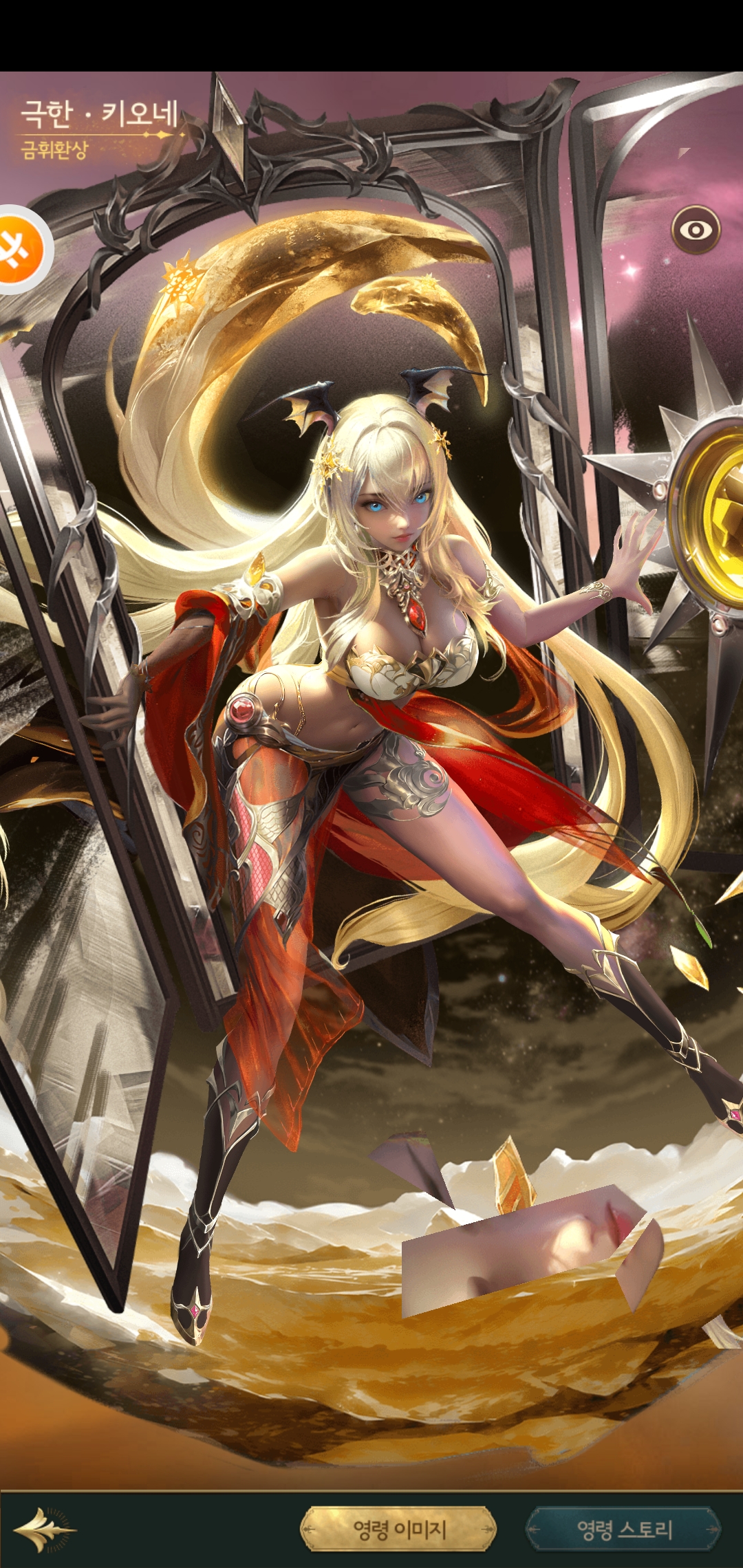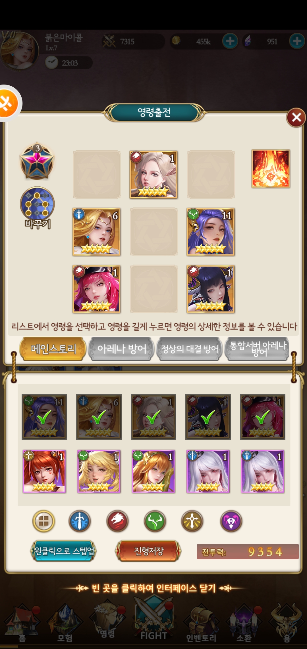 출전은 총 5개의 캐릭터를 배치하게 된다. 원클릭으로 스텝업을 누르면 전투력 순으로 알아서 편성해준다. 보다시피 5성 5명으로 편성이 가능하다. 당연히 성급업은 해야 하지만 일단 5성을 갖고 시작하니까 입문은 수월하다. 이미지 감상도 굉장히 후하다. 영령에 들어가서 '영령 미리보기'를 눌러보면 다 볼 수 있다. 흑백처리나 그런 것도 없고 원본 그래도를 다 감상할 수 있다. 감상 모드도 다 볼 수 있다.