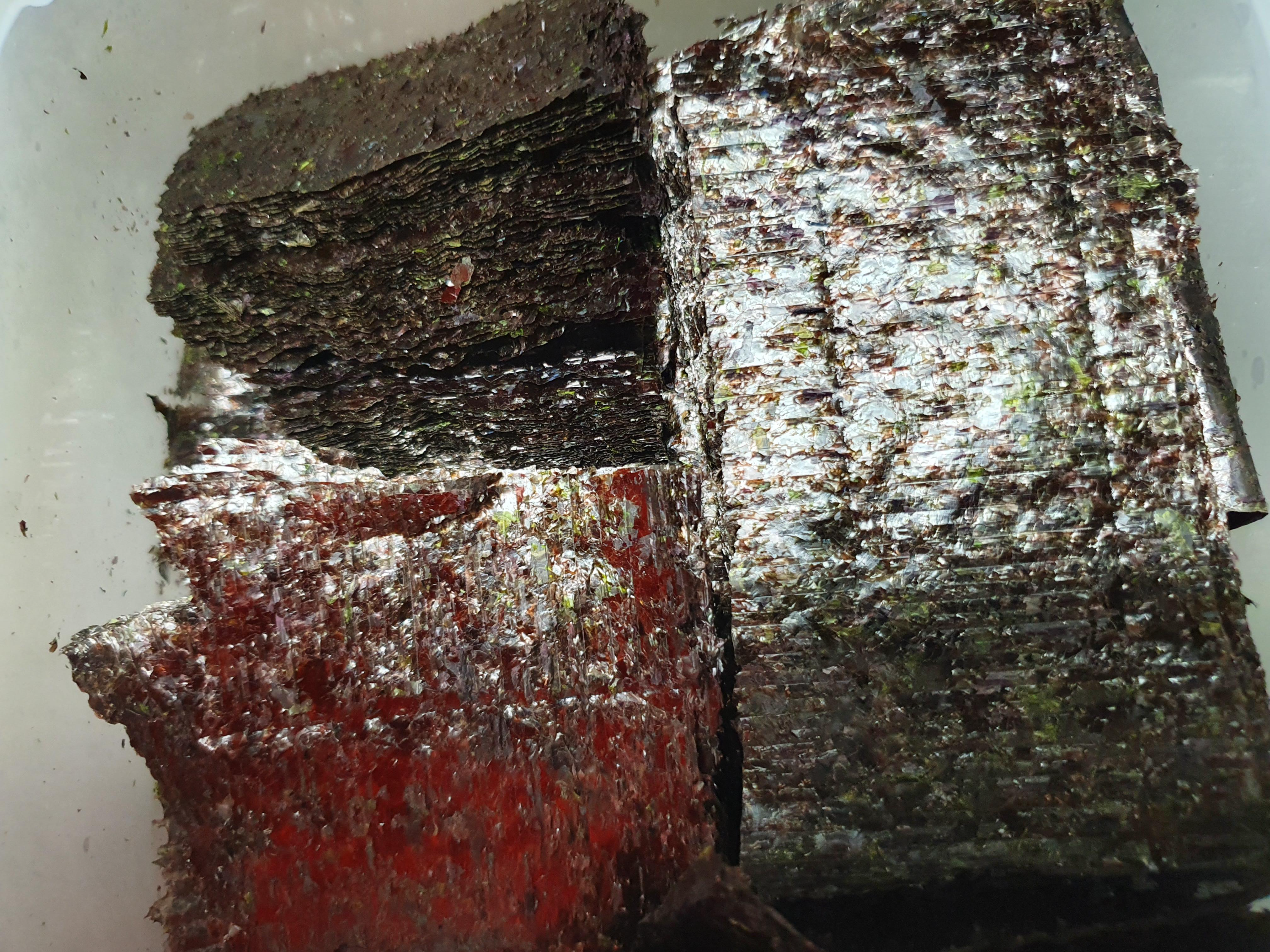 이 경우는 상품마다 칼로리에 차이가 있으니 참고하시고요. 일반적으로 보면 조미한 구운김의 경우 큰 거 말고 잘린 작은 거 한 장에 '3칼로리' 정도 됩니다. 이는 방금 말했듯이 일반적인 칼로리 계산이고 '상품마다 칼로리 차이'가 있다는 점, 꼭 명심하세요.