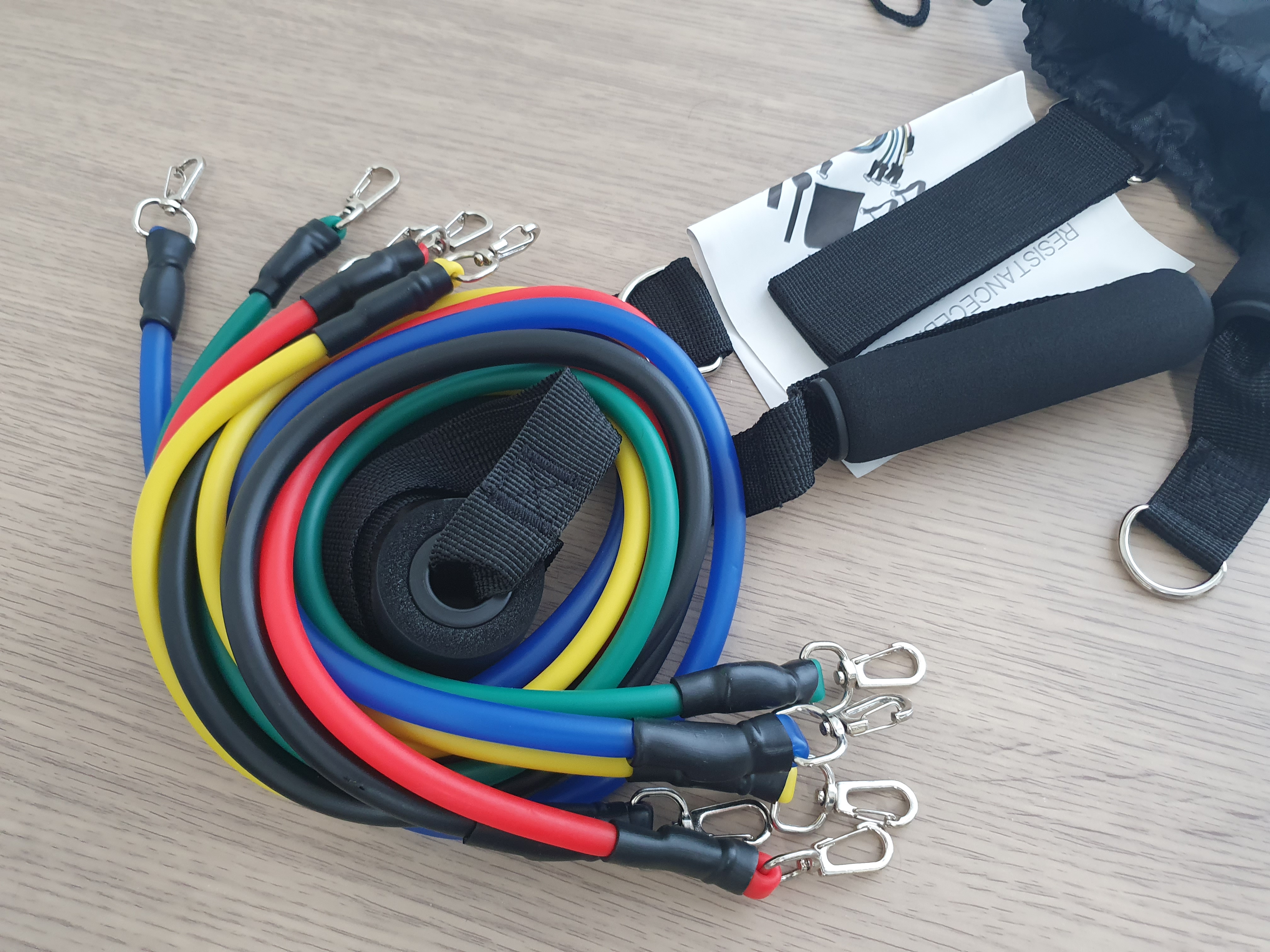 구성은 이렇게 되어있다. 색상 별로 강도가 다르다. 노란색이 제일 가볍고 레드 < 그린 < 퍼플 < 블랙 순이다. 블랙은 13.6kg 정도의 강도라고 되어있었다.