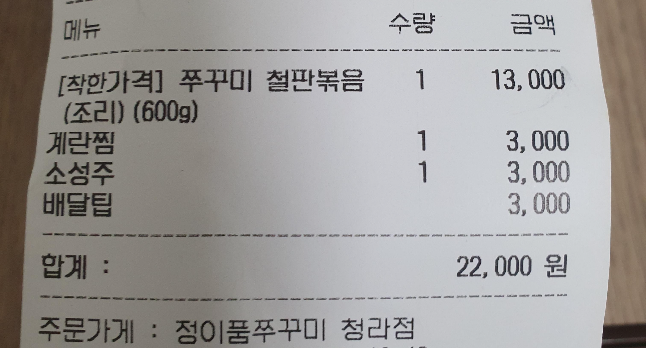 조금 매울 것 같기도 하고 밥 없이 술안주로 먹을 생각이어서 계란찜도 주문했는데 3000원이었고 소성주 판매하고 있어서 소성주까지 해서 배달팁 3000원에 총합 22000원 나왔다.