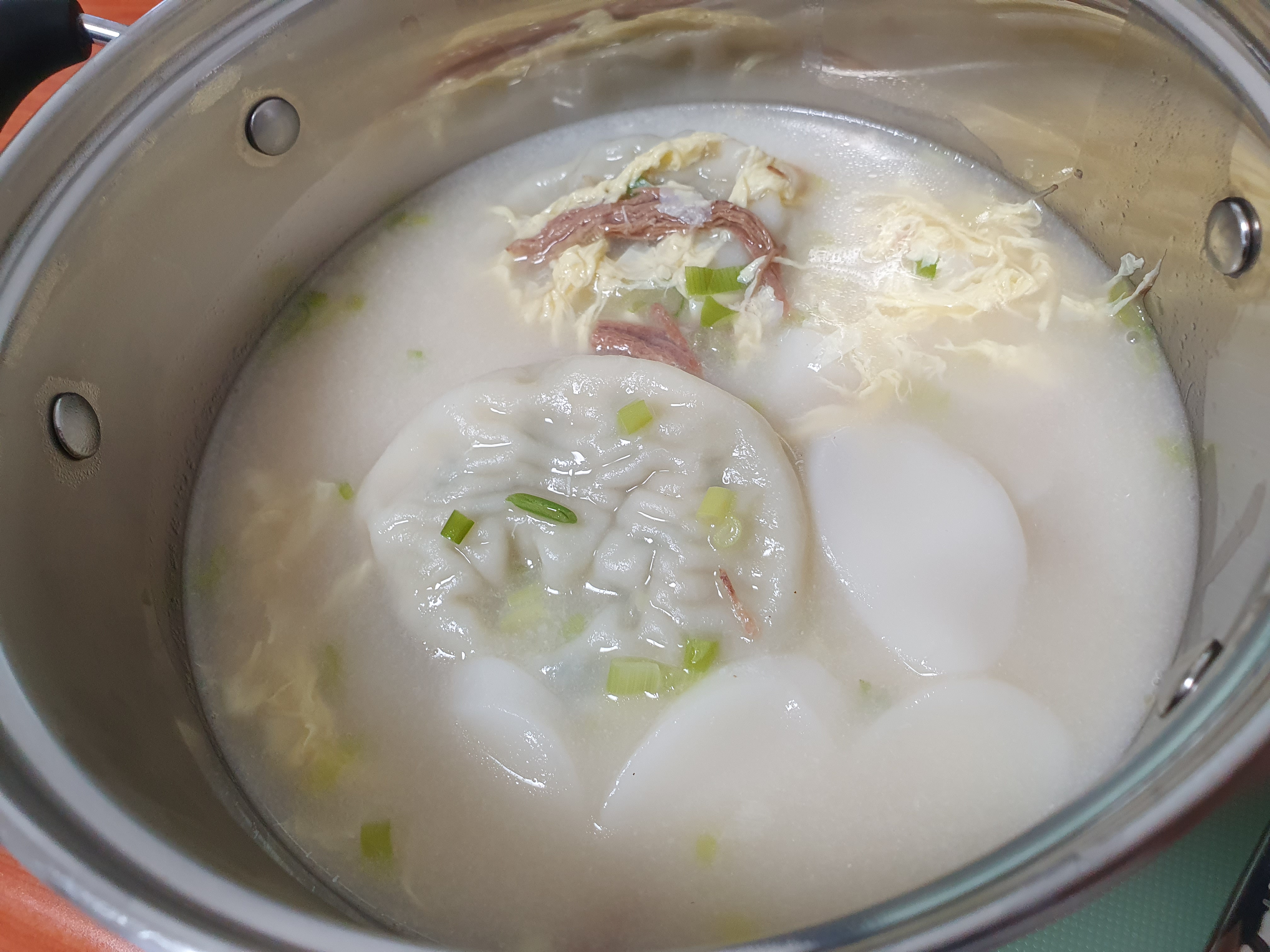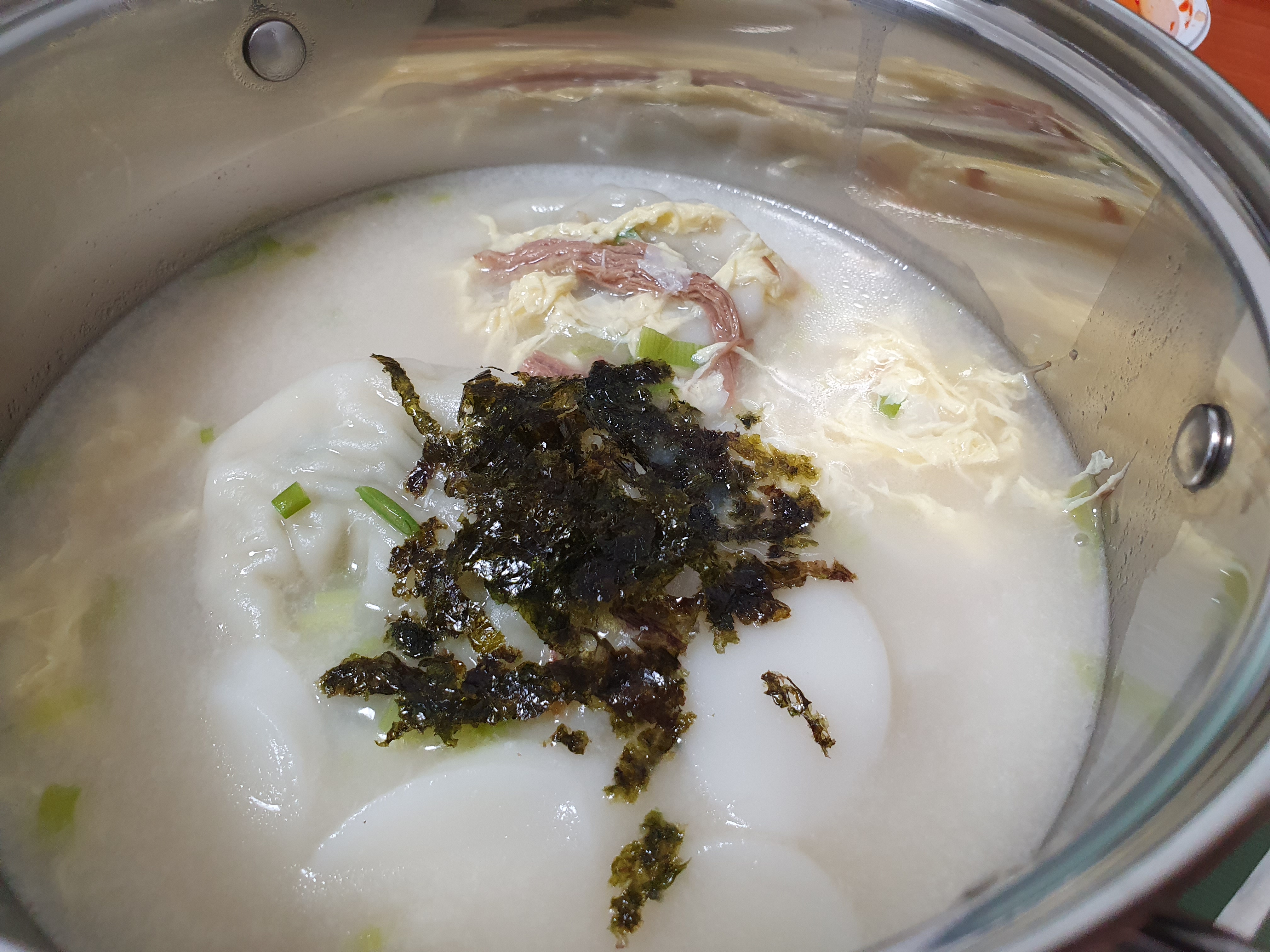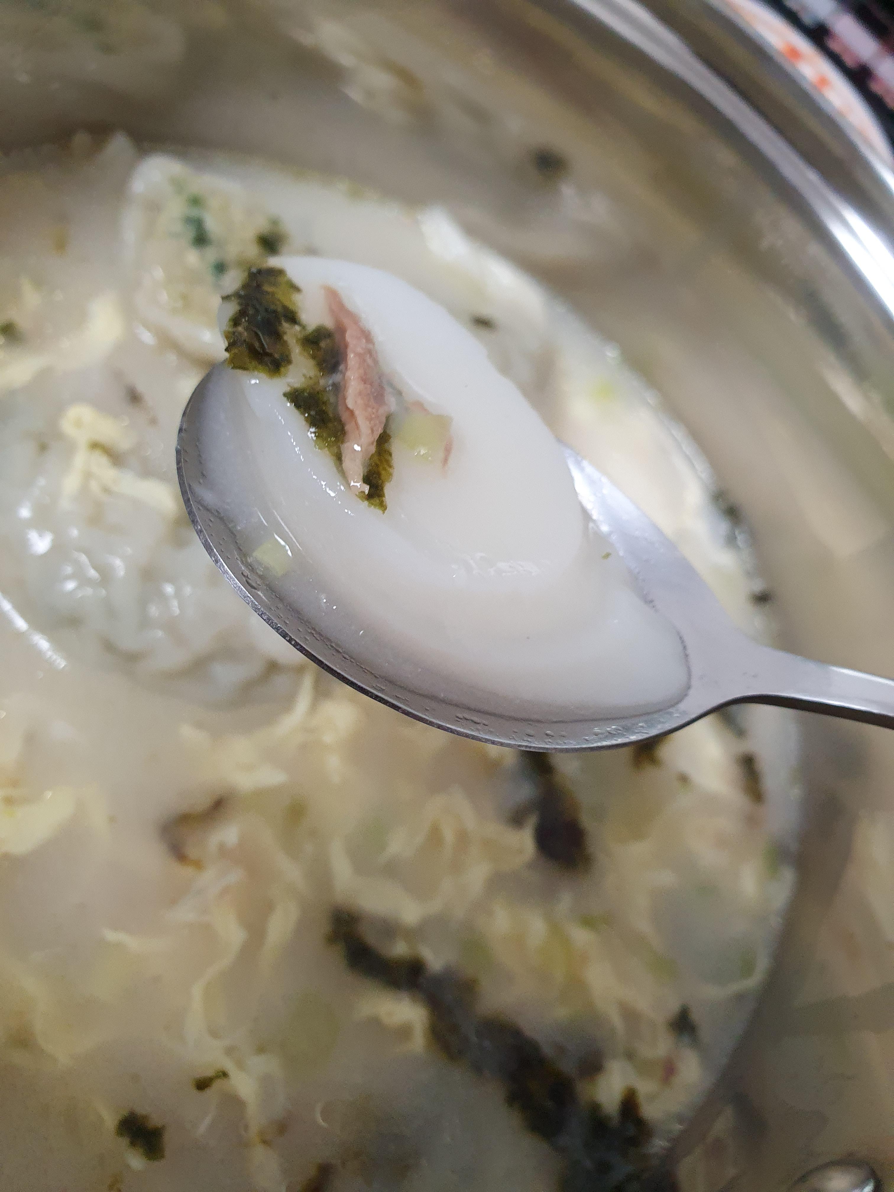왜냐면 뭐 다 익었긴 한데 만두도 속이 꽉차고 고기 속 맛이 아주 진하게 느껴질 정도로 맛있는 만두이긴 한데 좀더 끓여서 익혀주는 게 좋을 것 같고 떡도 아주 탱글하다. 먹기에 문제는 없으나 좀 더 끓여서 좀 더 보들보들함을 부여하면 좋을 듯싶다.