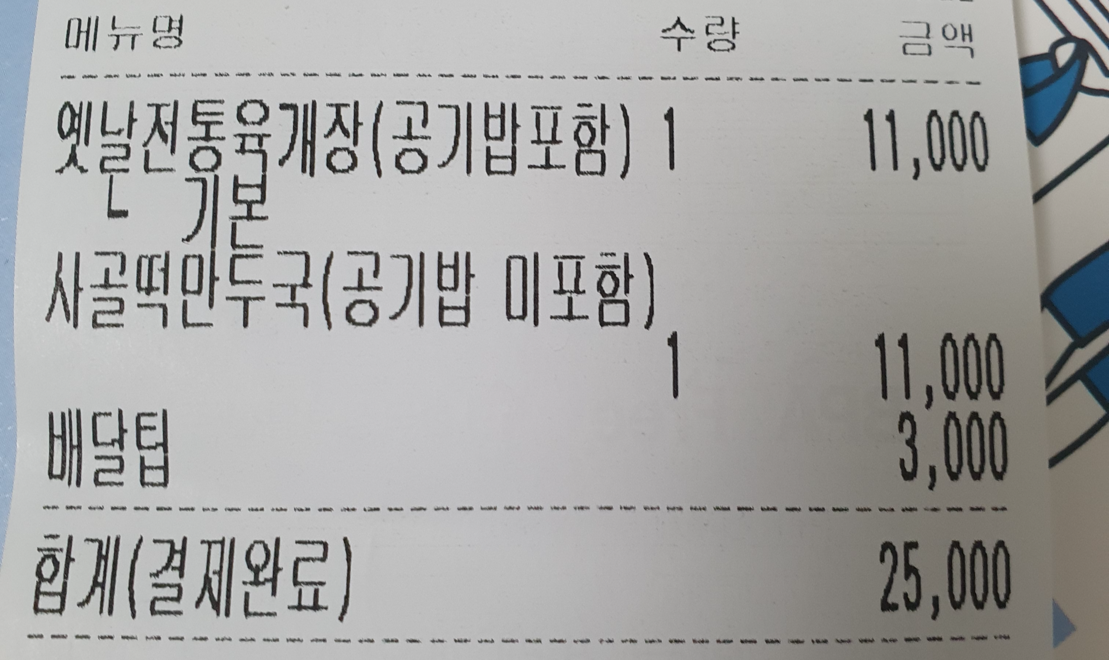 배달팁은 3000원이어서 육개장 포함 총합 25000원 나왔다.