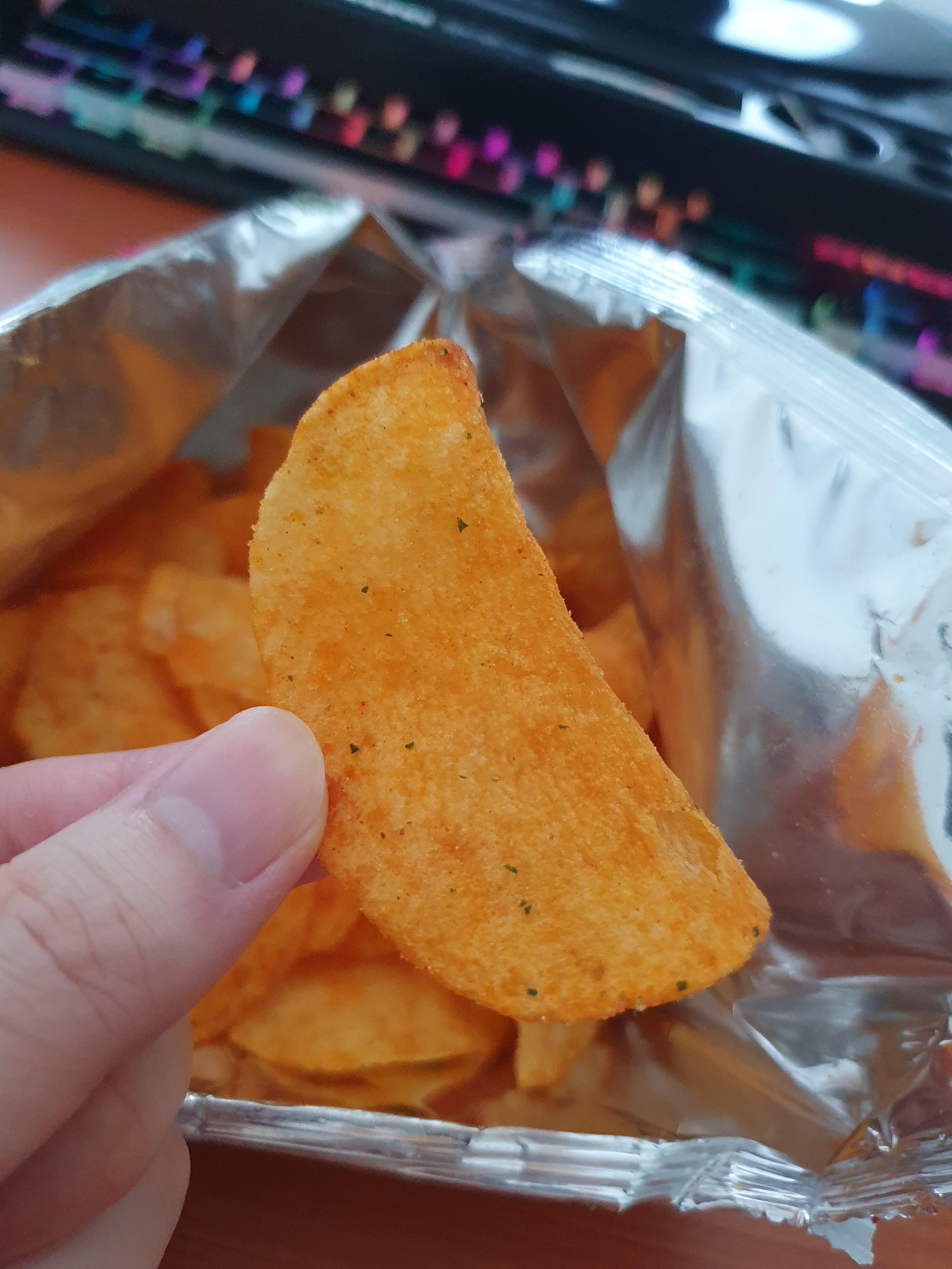 맛은 익히 아는 포테토칩 오리지널의 식감과 맛에서 페퍼로니 피자 시즈닝이 묻어있는 맛이다........ 어... 설명할 게 없구나...ㅋㅋ