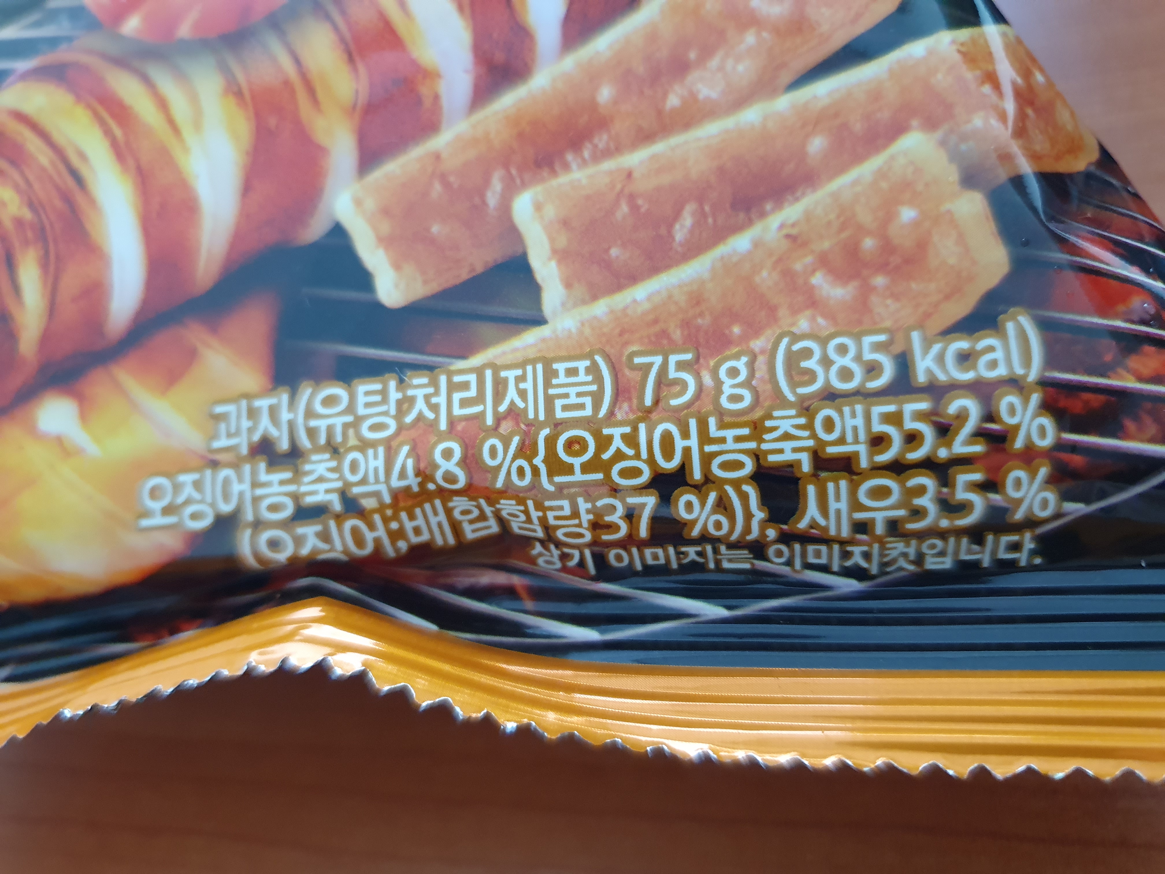 오징어농축액 4.8%가 들어간다는데 오징어 배합함량이 37%인 오징어농축액 55.2%가 들어가고 새우 3.5%가 들어간다고 한다.