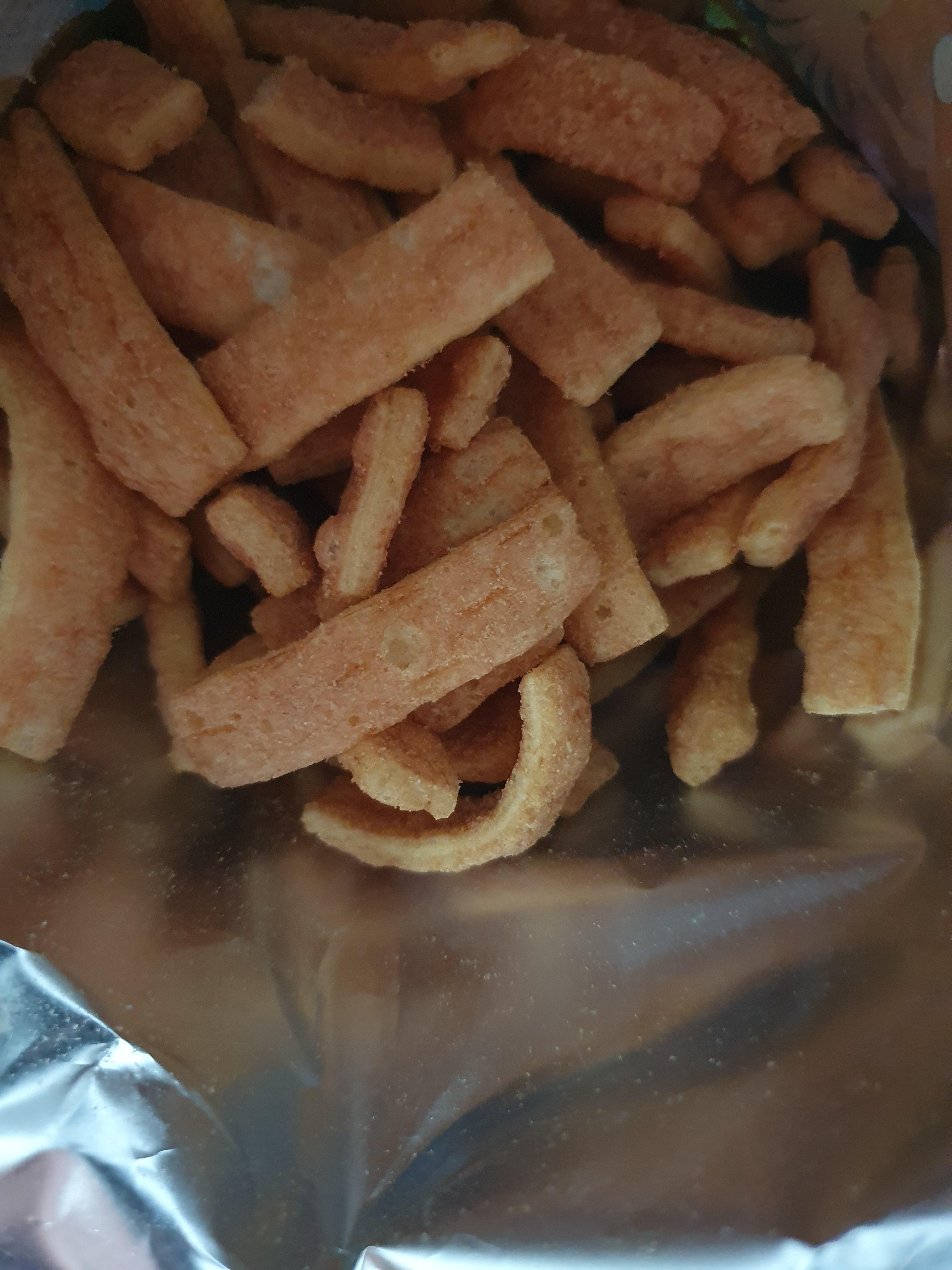 이게 좀 지리는게... 과자 모양도 그렇고 크기도 그렇고 그냥 말 그대로 바삭바삭한 과자의 특징을 극단적으로 살린 형태이다. 다른 재미난 모양을 내는 것이 아니라 '맛'을 제대로 느끼도록 만들었다는 얘기인데 크기가 작으니까 한입에 쏙쏙 들어가고 부족하다 싶으면 2~3개씩 막 넣어서 먹어도 되고 네모난 모양이라 양념이 넓은 면적에 딱딱 잘 박힌다.