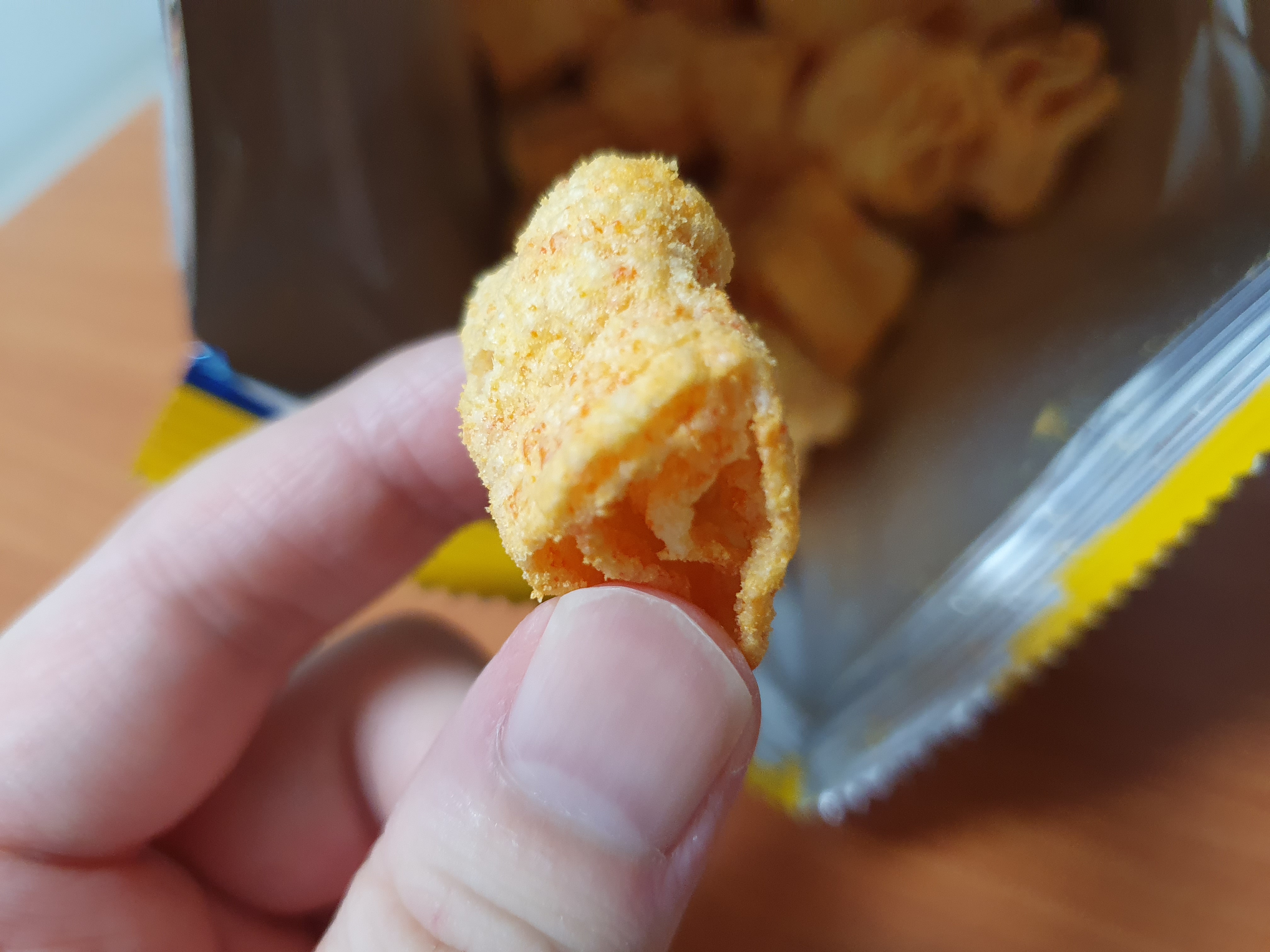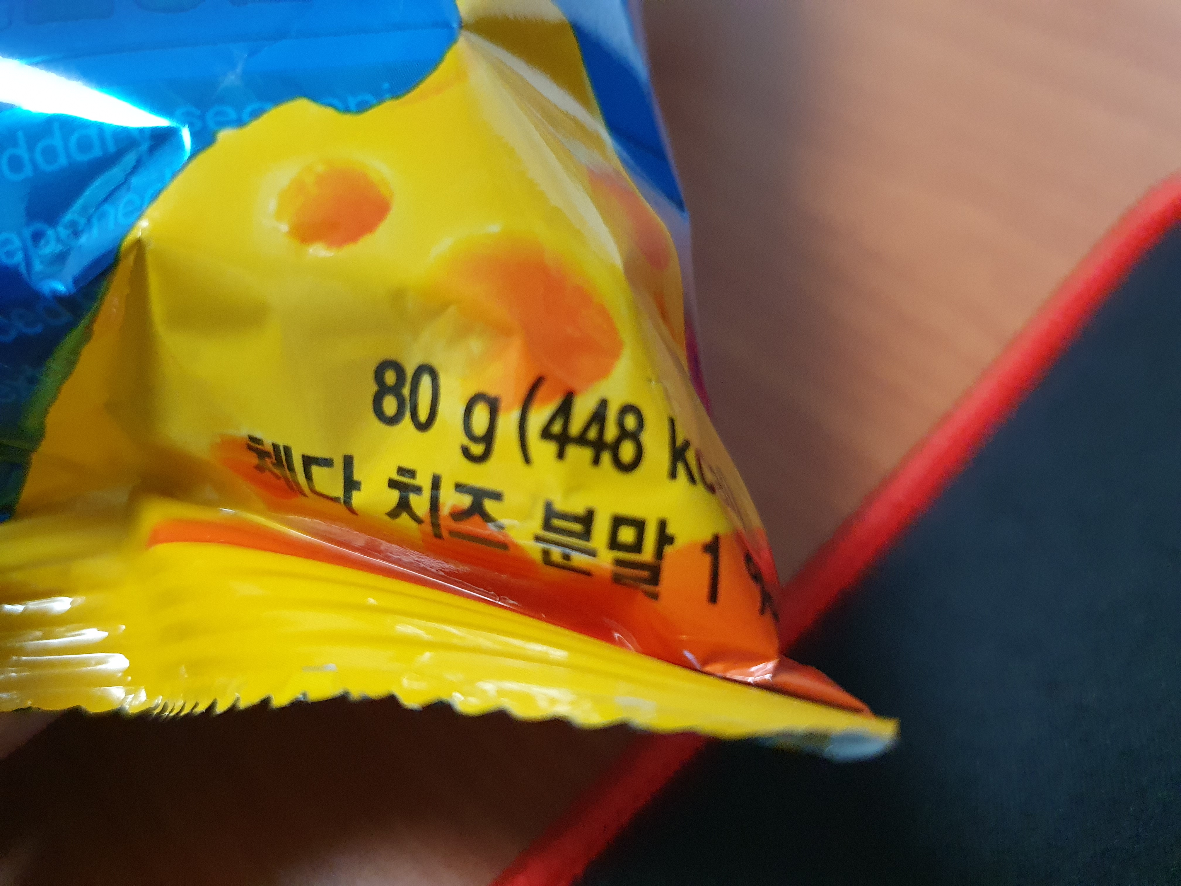 음... 뜯자마자 꼬릿꼬릿한 냄새가 올라온다. 좀 심히 올라오긴 했는데 그렇게 막 식욕 떨굴 정도는 아니다. 그리고 막상 과자를 먹으면 그런 꼬릿함은 거의 없고 치즈맛만 느껴진다.