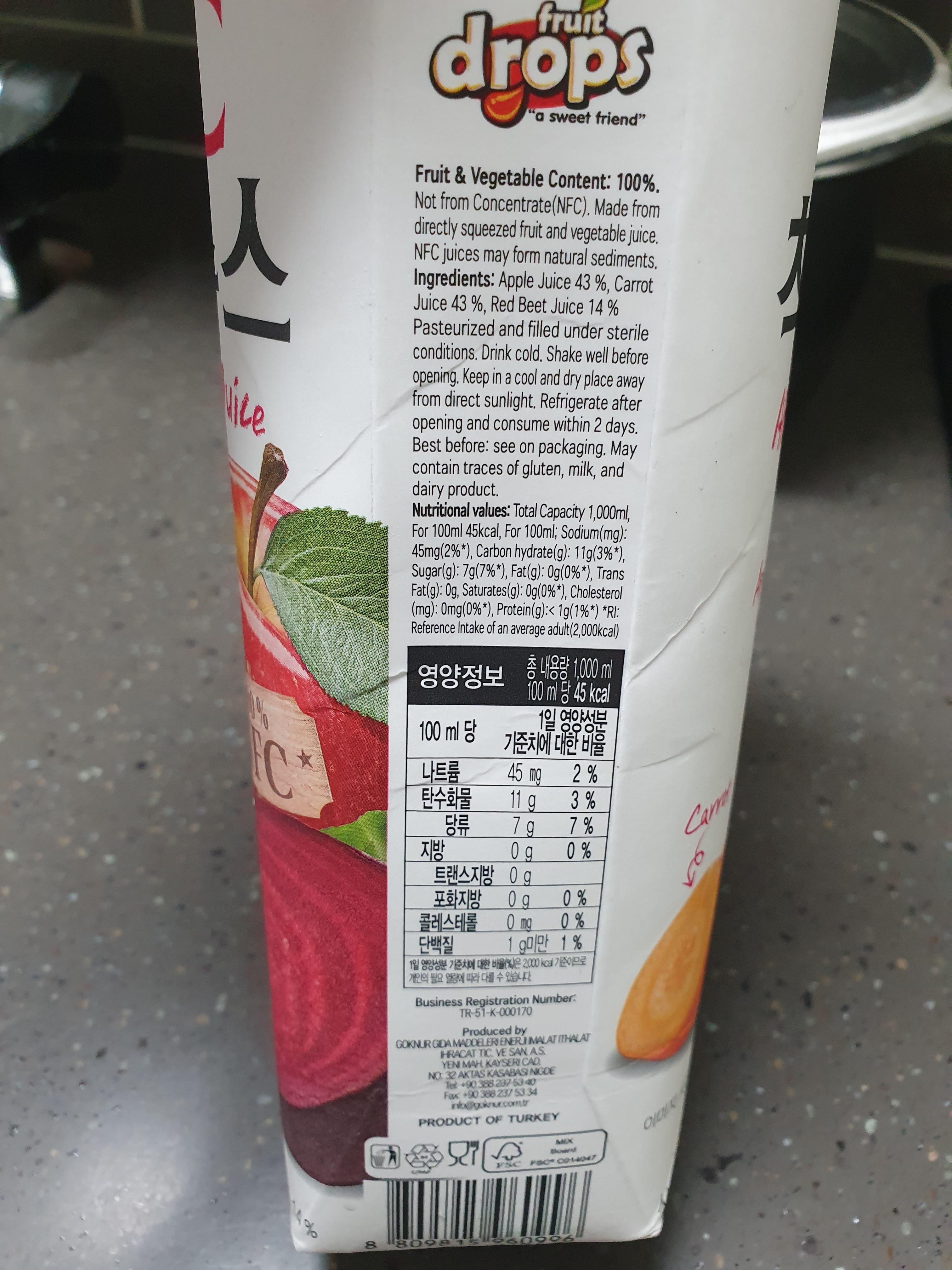 거기에 살짝 새콤함도 있어서 맛 자체는 꽤 오묘한 맛이 나고 잘은 모르겠지만 살짝 설탕도 들어가는 것 같긴 한데... 원재료명에 사과착즙액, 당근착즙액, 비트착즙액만 있어서 그냥 내 기분탓인가 보다...