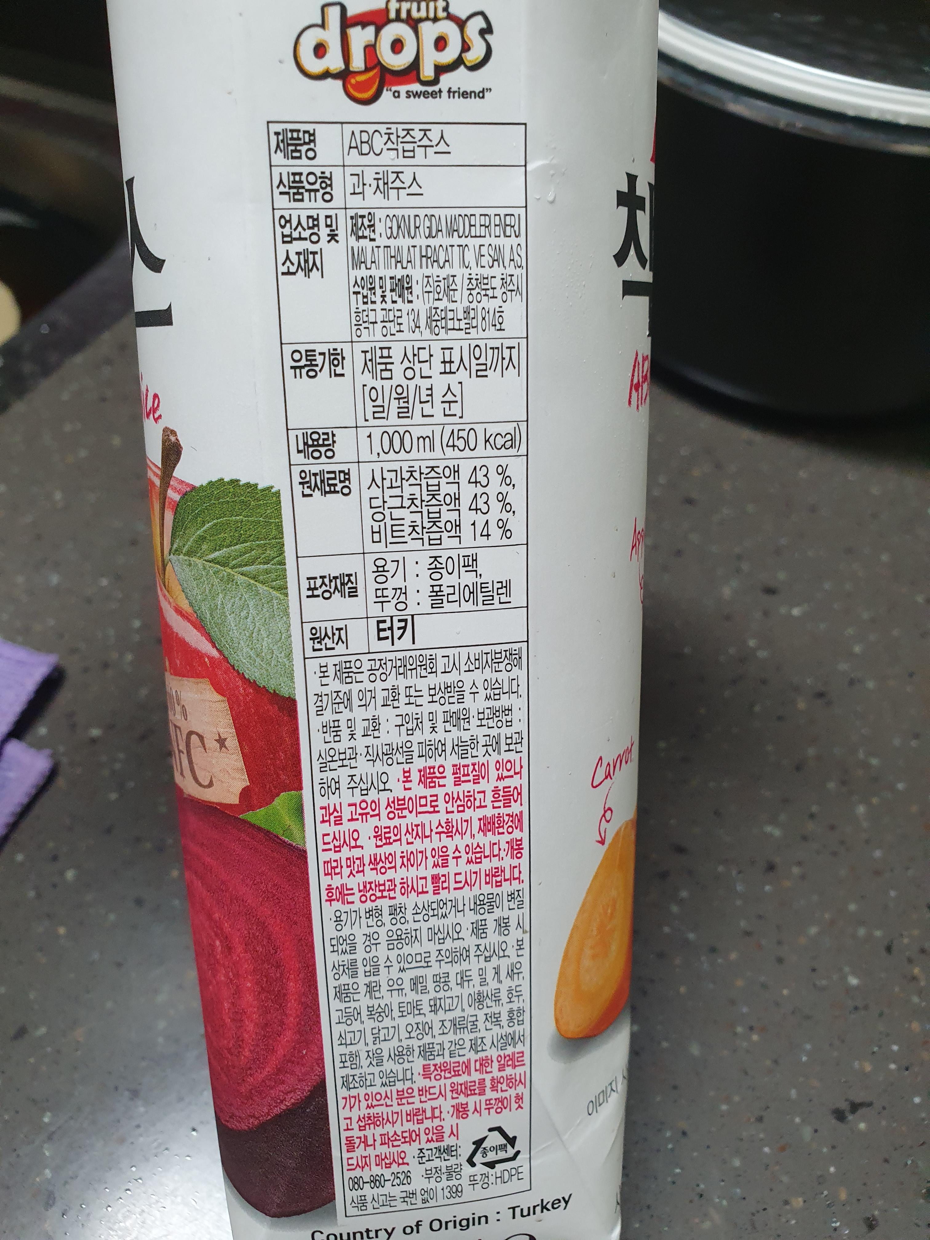 ABC 좋아하고 난 참고로 즙이나 한약 같은 것도 잘 먹는다. 되려 찾아먹을 정도인데 ABC 착즙주스 이거는 내가 좀 많이 거슬리는 맛이 있었어서 그게 내 개인적으로 문제이지, 이게 뭐 안좋다는 얘기는 아니다.