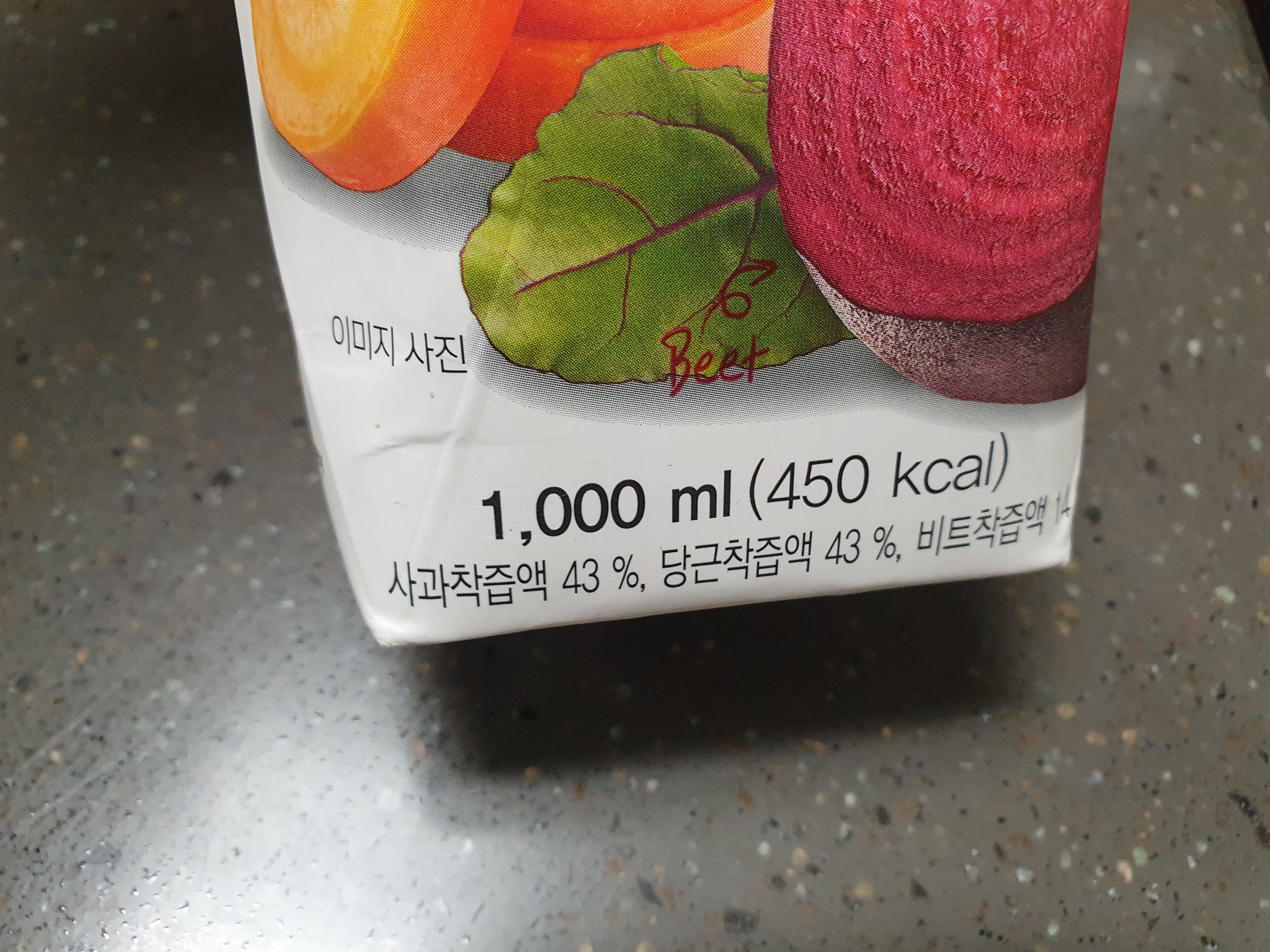 사과착즙액 43%, 당근착즙액 43%, 비트착즙액 14%이다.
