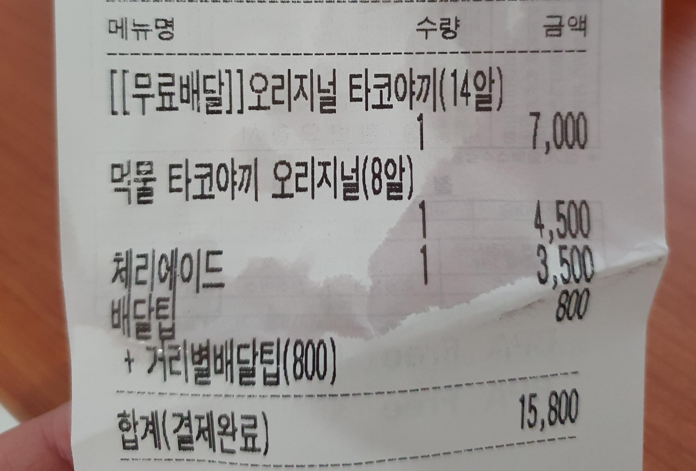 오리지널 타코야끼 14알 7000원, 먹물 타코야끼 오리지널 8알 4500원, 체리에이드 3500원, 배달팁 800원해서 총합 15800원 나왔다.
