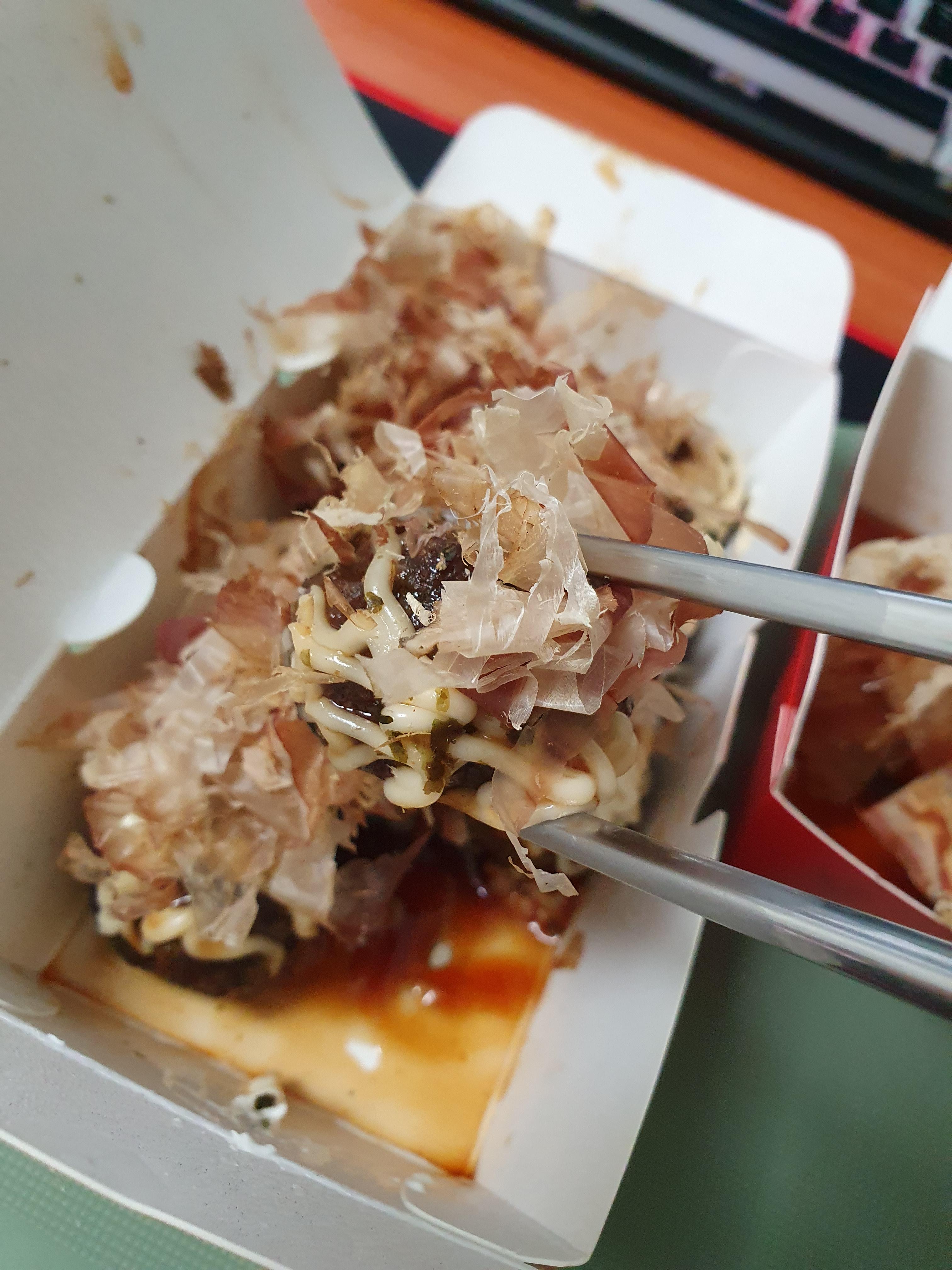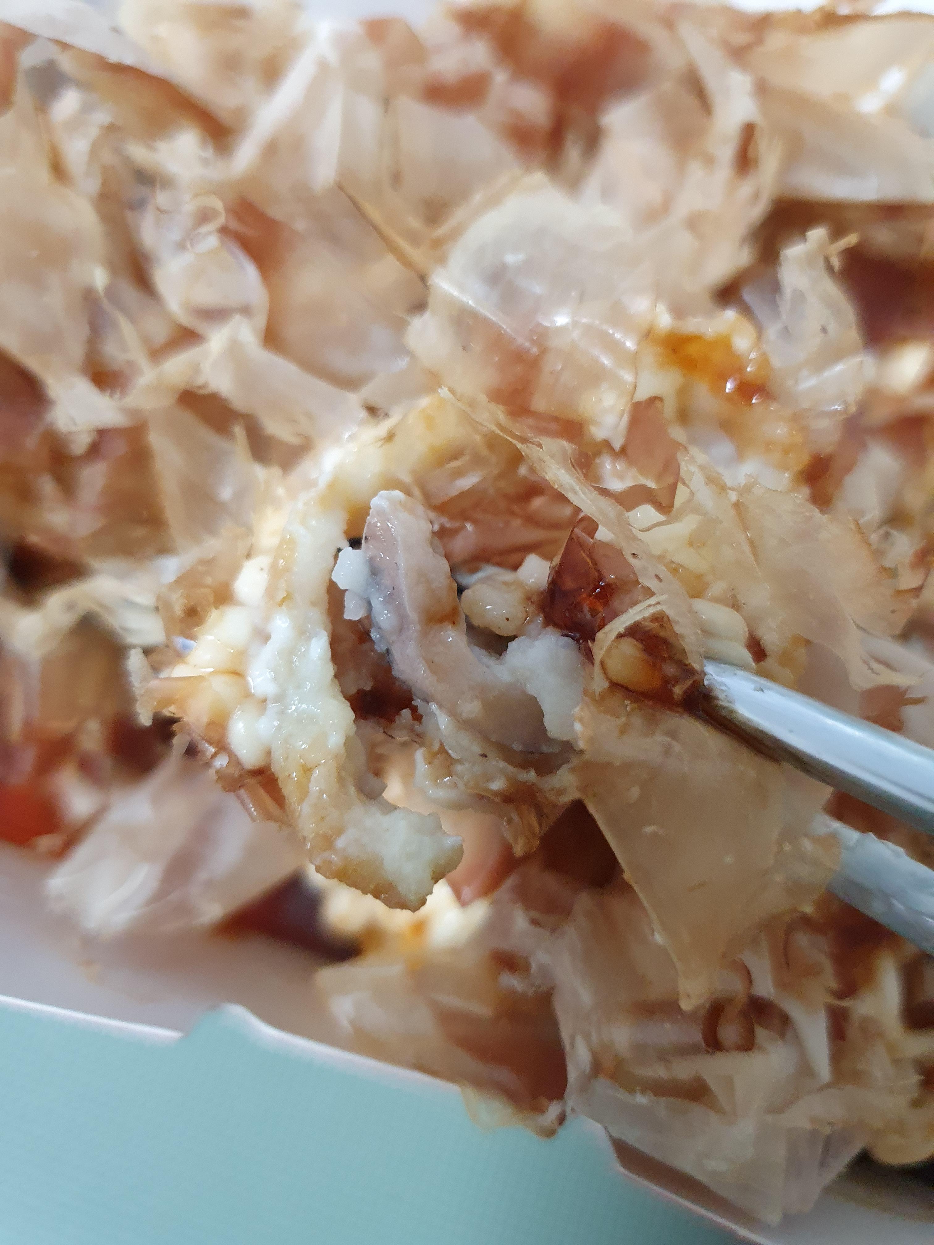 사진에서는 사이즈가 가늠이 안되지만 실제로 보면 좀 작은 타코야끼이다. 일반적인 타코야끼집에 비해서 아주 살짝 작다.
