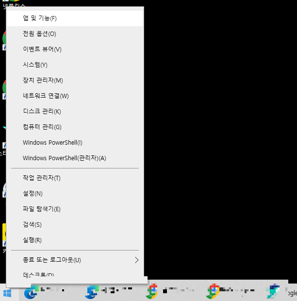 일단 제거를 위해서는 바탕화면 왼쪽 최하단에 '윈도우 아이콘'을 마우스 우측 클릭해 보면 '앱 및 기능'이 있다.