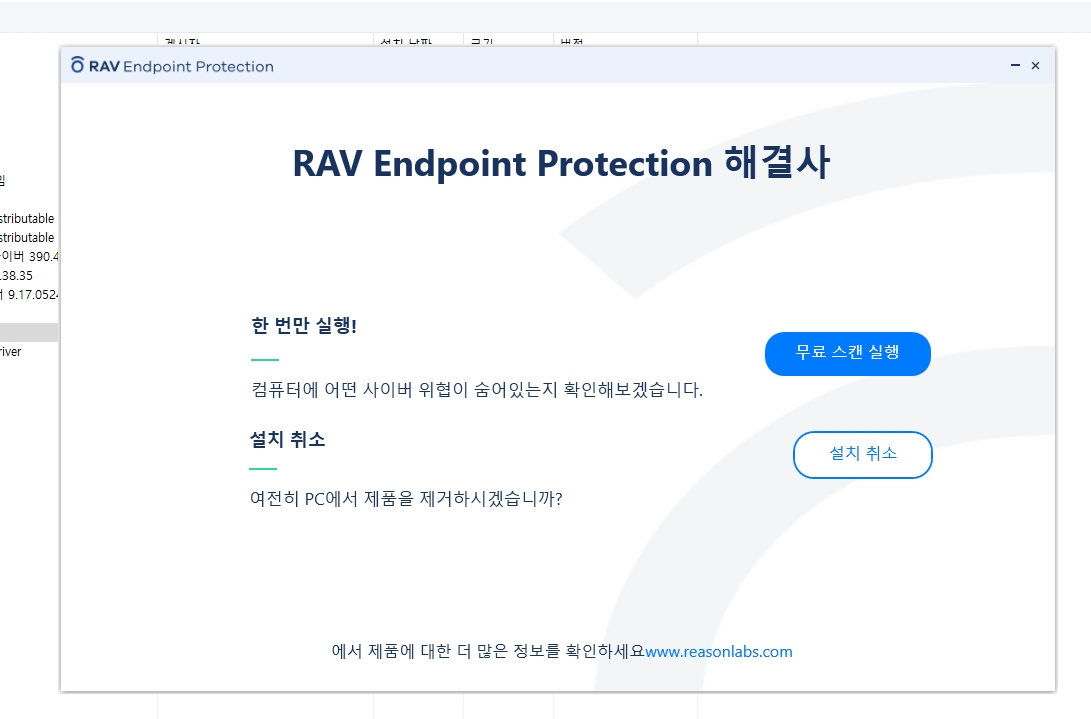 마찬가지로 'RAV Endpoint Protection'를 찾아서 제거해 주면 된다.