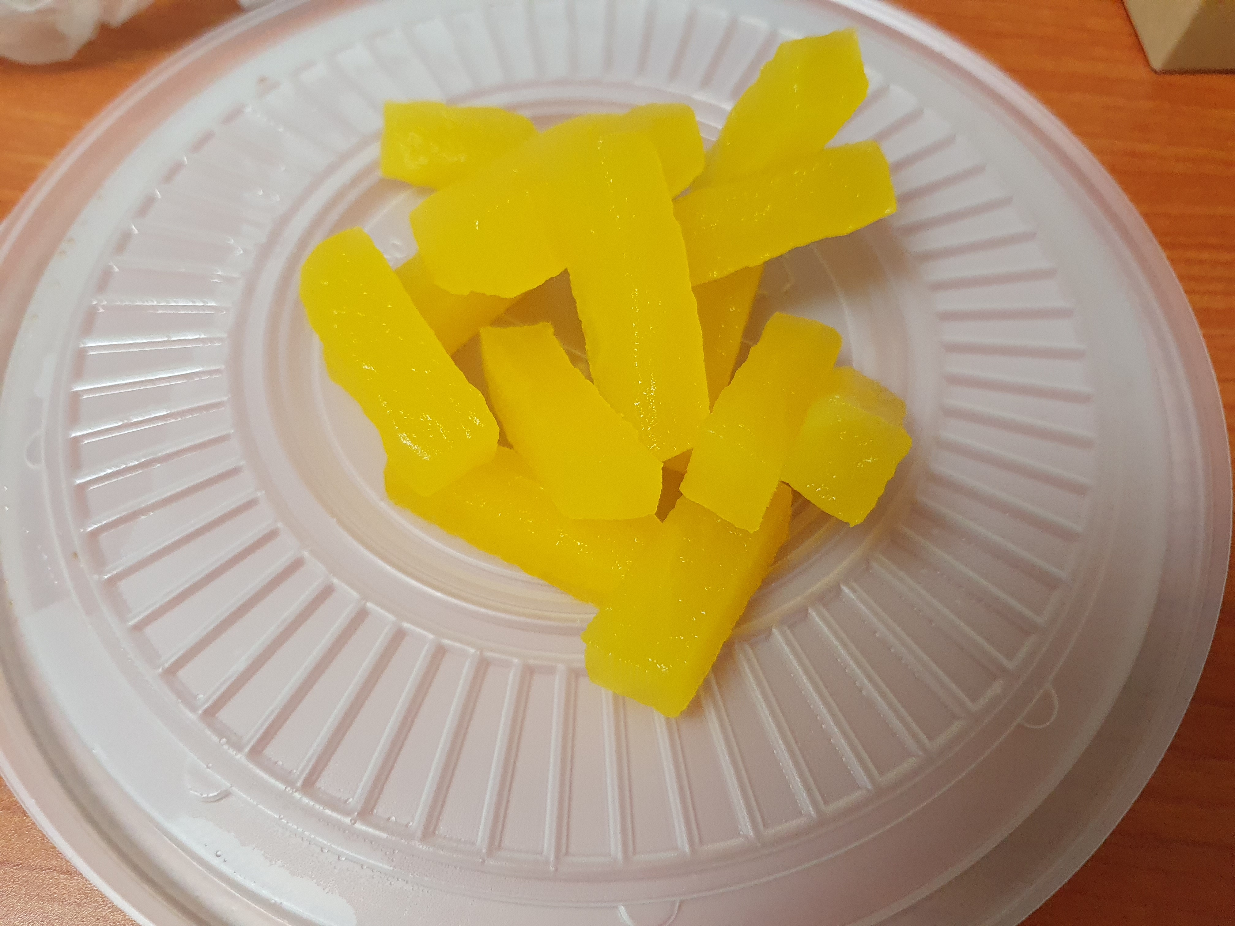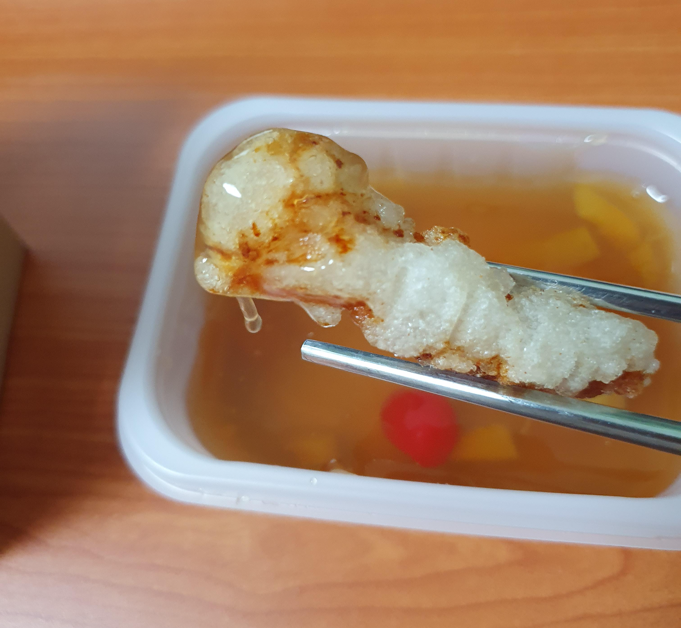 그... 후르츠 맛이 좀더 강하다고 보면 되는데 후르츠의 달콤함이 더 강하다고 보면 되겠다. 음... 잘 보면 소스에 '양파 하나가 없다.' 그냥 딱 후르츠 통조림 전부 다 넣어서 조리한 탕수육 소스로 보인다. 사실 양파가 좀 들어가야 그 양파의 달달함과 알싸함이 소스맛을 더 좋게 만든다고 생각하는데... 음... 솔직히 말해서 소스는 좀 많이 아쉬웠다.