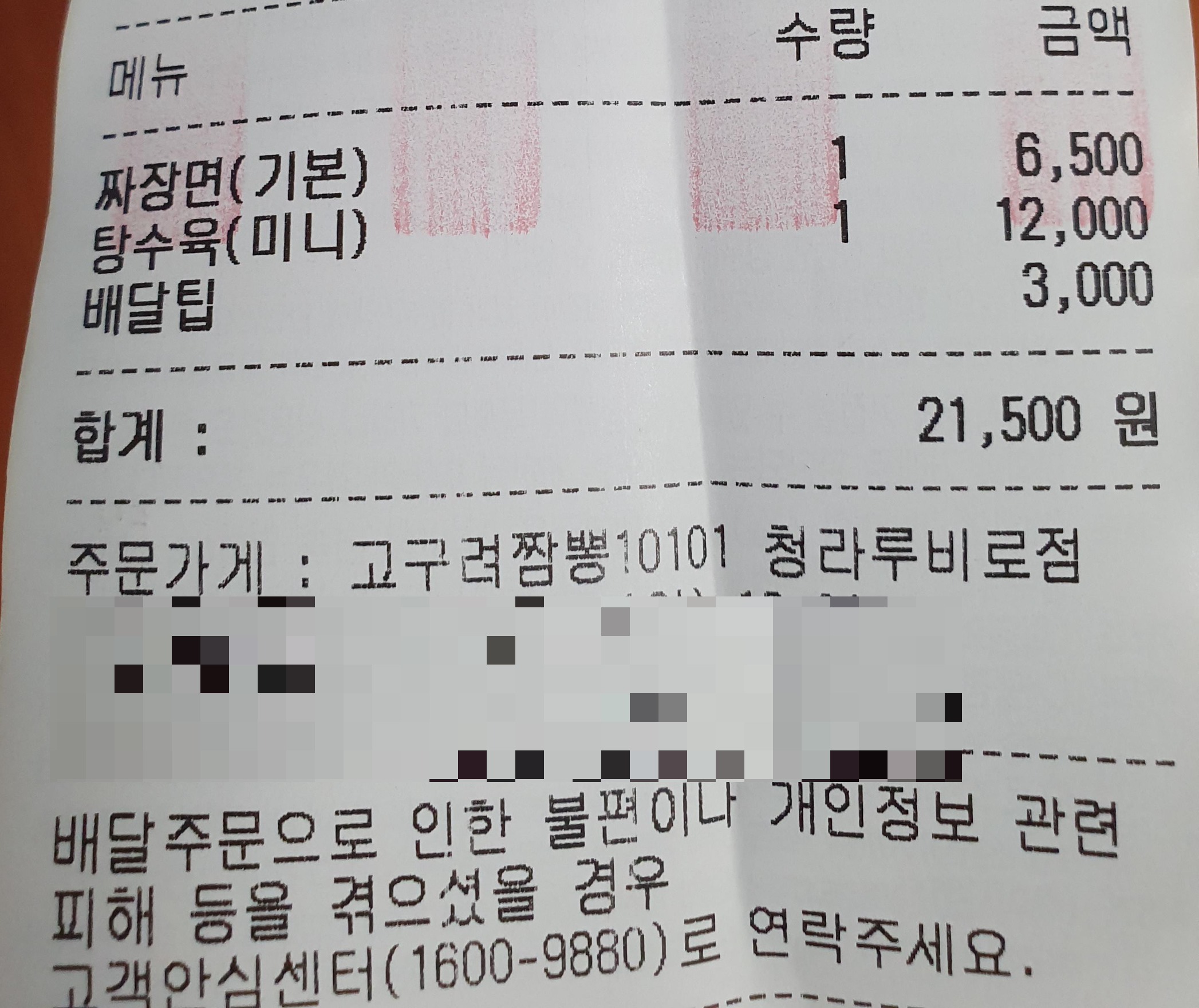 짜장면 기본은 6500원이고 탕수육 미니 사이즈는 12000원이다. 배달팁은 3000원이었고 총합 21500원 나왔다.