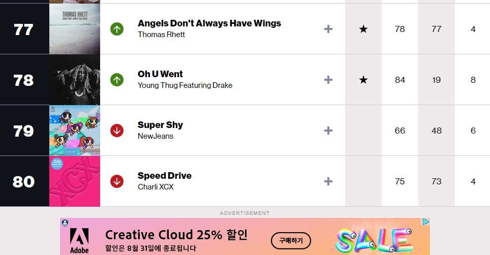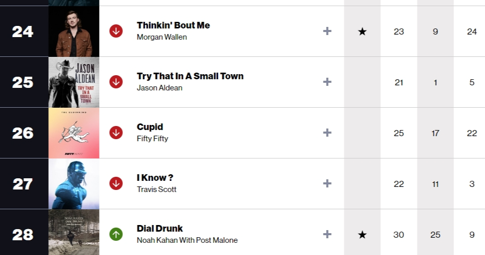 TOP10 안에는 케이팝이 없다. 정국의 '세븐'이 잠시동안 TOP10 안으로 순위를 기록하고 있었는데 현재는 빠져있다. 정국의 세븐 같은 경우는 케이팝 장르라고 하기는 어렵고 전부 영어곡이라서 사실상 영어권을 제대로 타겟팅 했는데 어쨌건 한국인으로써 빌보드HOT100 차트에서 최고 순위가 1위였나 2위였나... 아 확인해보니 1위 찍혀있네ㅎㅎ 1위까지 먹었으니 대단한 일임은 틀림이 없다.