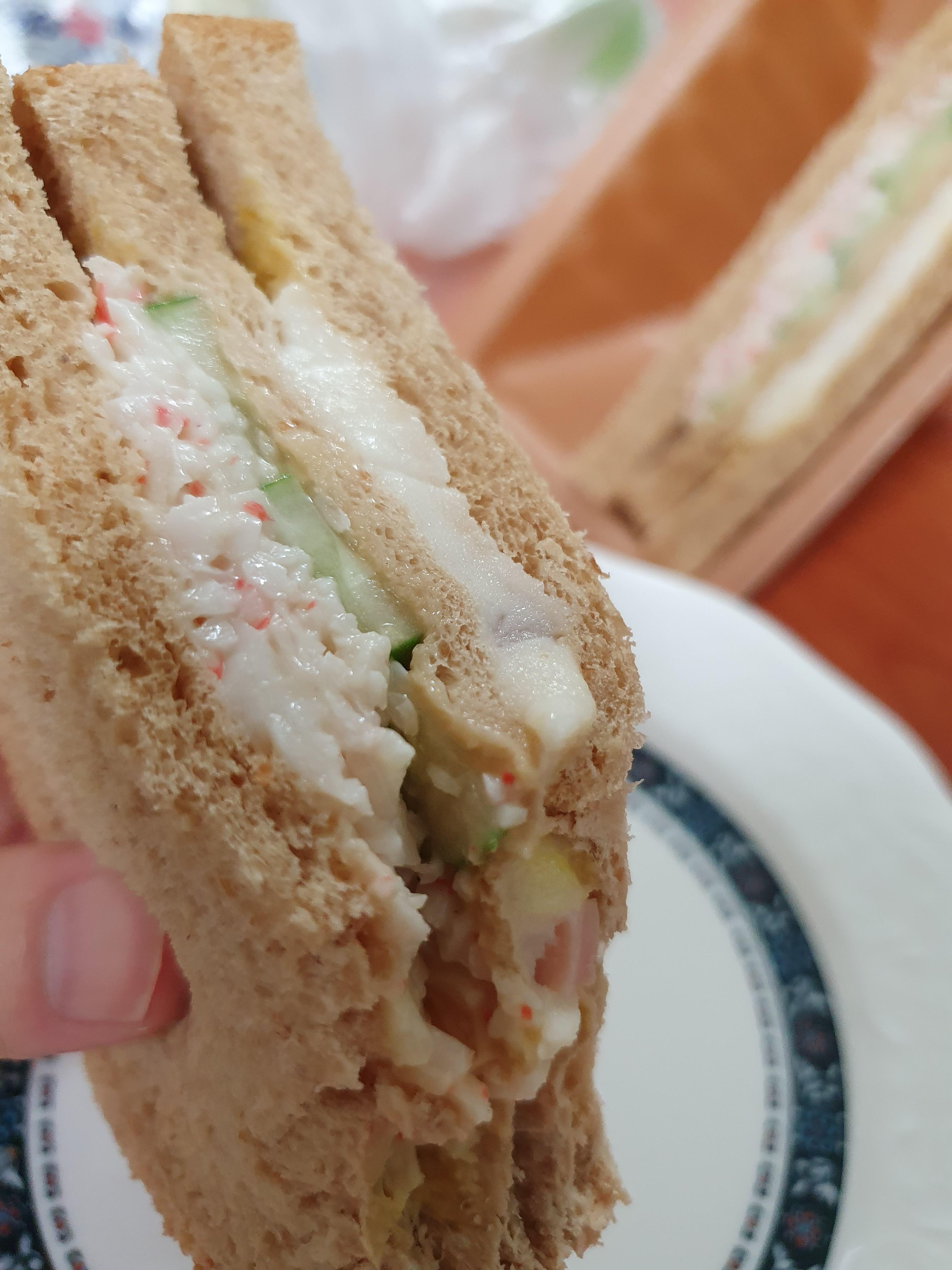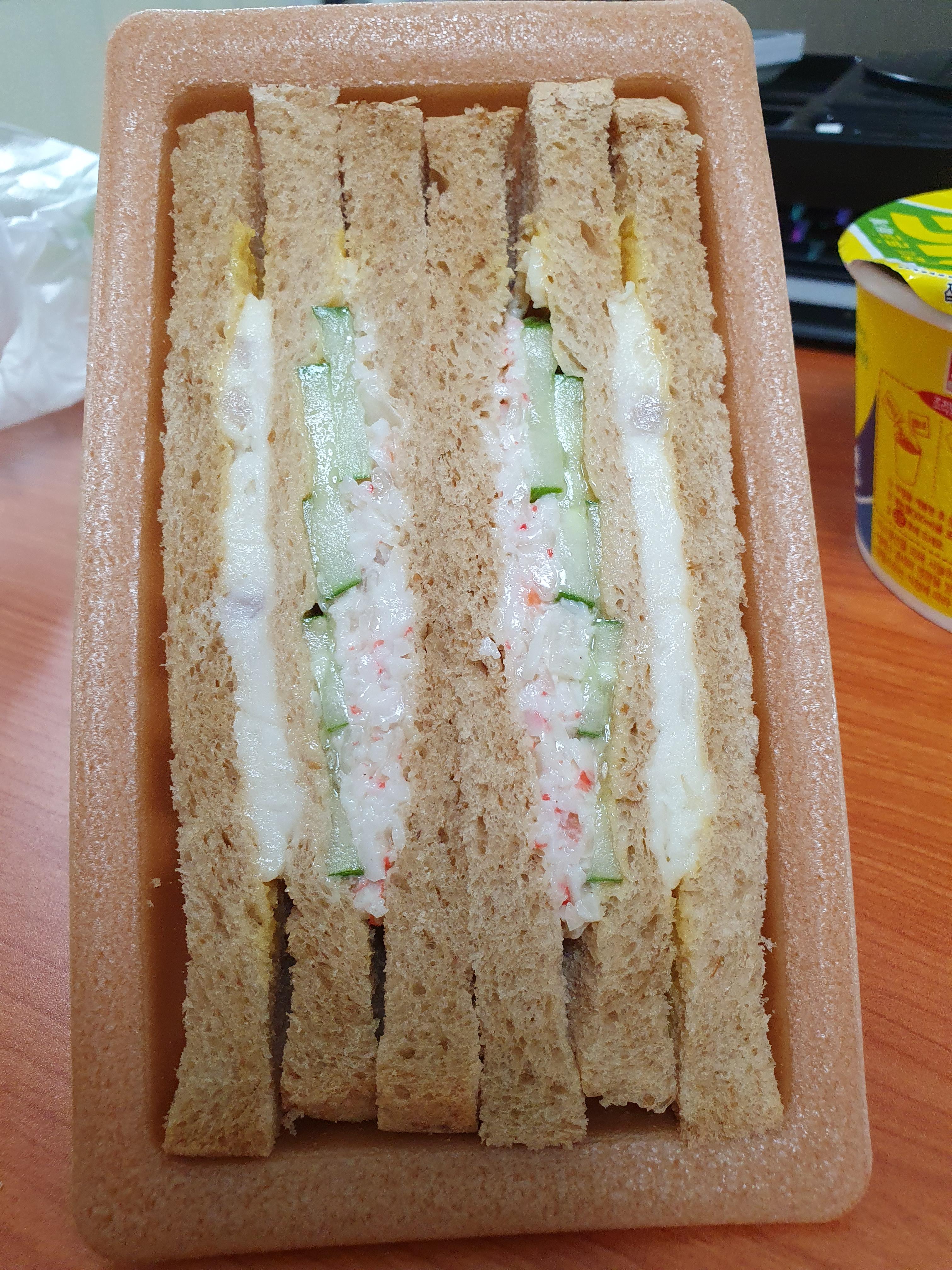 크으... 내용물은... 그냥 내가 좋아하는 거 다 들어있네ㅋㅋ 맛살, 감자, 마요네즈, 오이는 정말 샌드위치에 들어가면 존맛이다. 개운하고 소화가 잘되는 느낌을 주고 식감과 오이의 향도 샌드위치하고 너무 잘 어울린다. 피클은 안 좋아하는데 생오이가 샌드위치에 들어간 것은 정말 좋아한다. 거기에 머스터드인지 겨자소스인지 살짝 발라놓은 거... 진짜 이거 편의점 샌드위치에 최초로 시도한 사람 감다살 제대로이다. 겨자향이 샌드위치의 잡내들을 잡아주면서 맛을 더 상승시킨다.