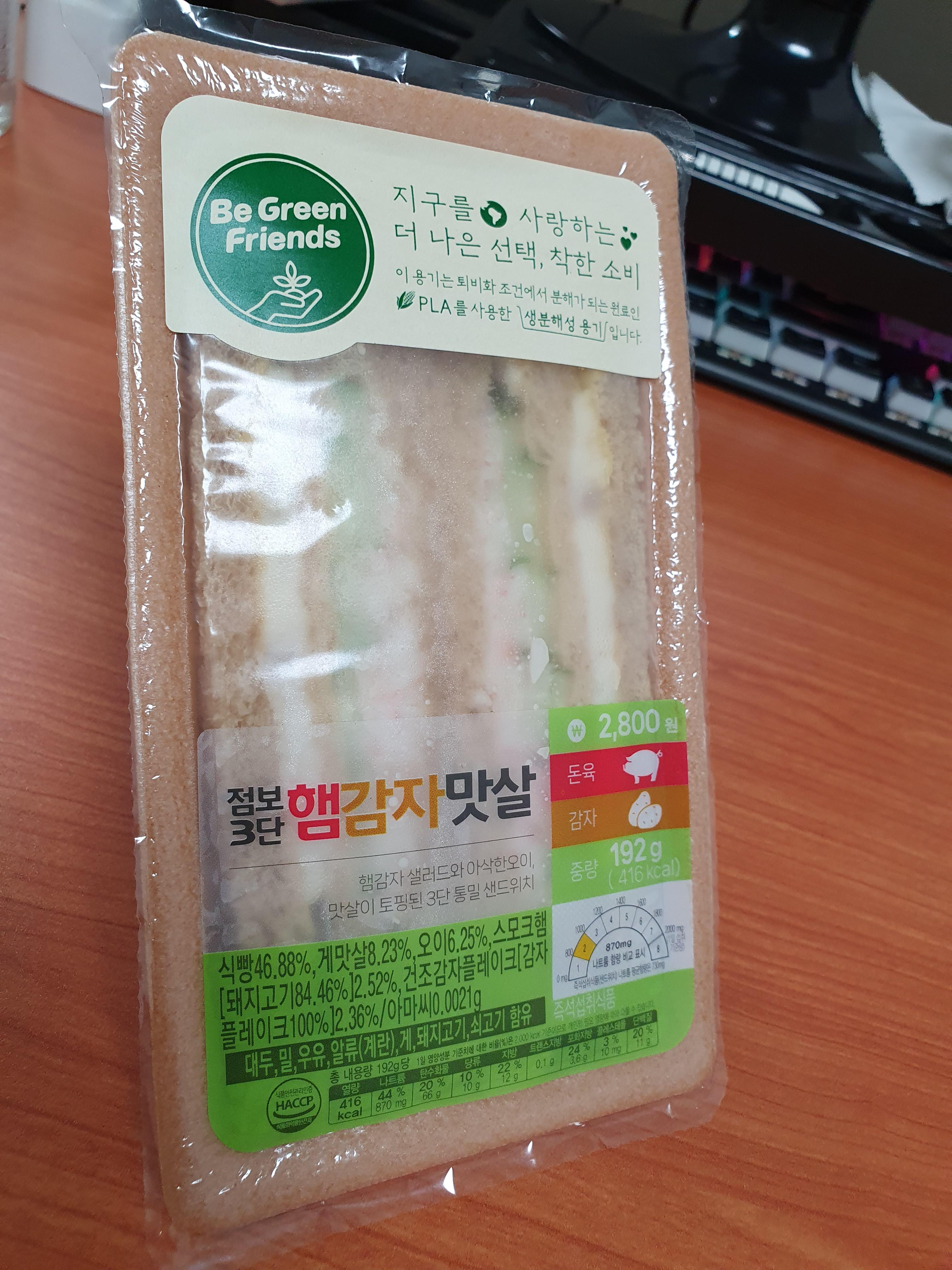 가격은 2800원이고 192g에 416칼로리였다. 와... 416칼로리?!... 아니 뭐 샌드위치가 칼로리가 높다는 건 아는데 새삼 놀랍네. 배달 샌드위치들은 칼로리가 안적혀있으니까... 이것도 어찌 보면 편의점 샌드위치의 장점이다. 영양정보를 쉽게 알 수 있다. 그에 비해 나트륨은 870mg로 고작 2등급이다. 즉, 되려 건강한 프레쉬한 샌드위치ㅎㅎ;;