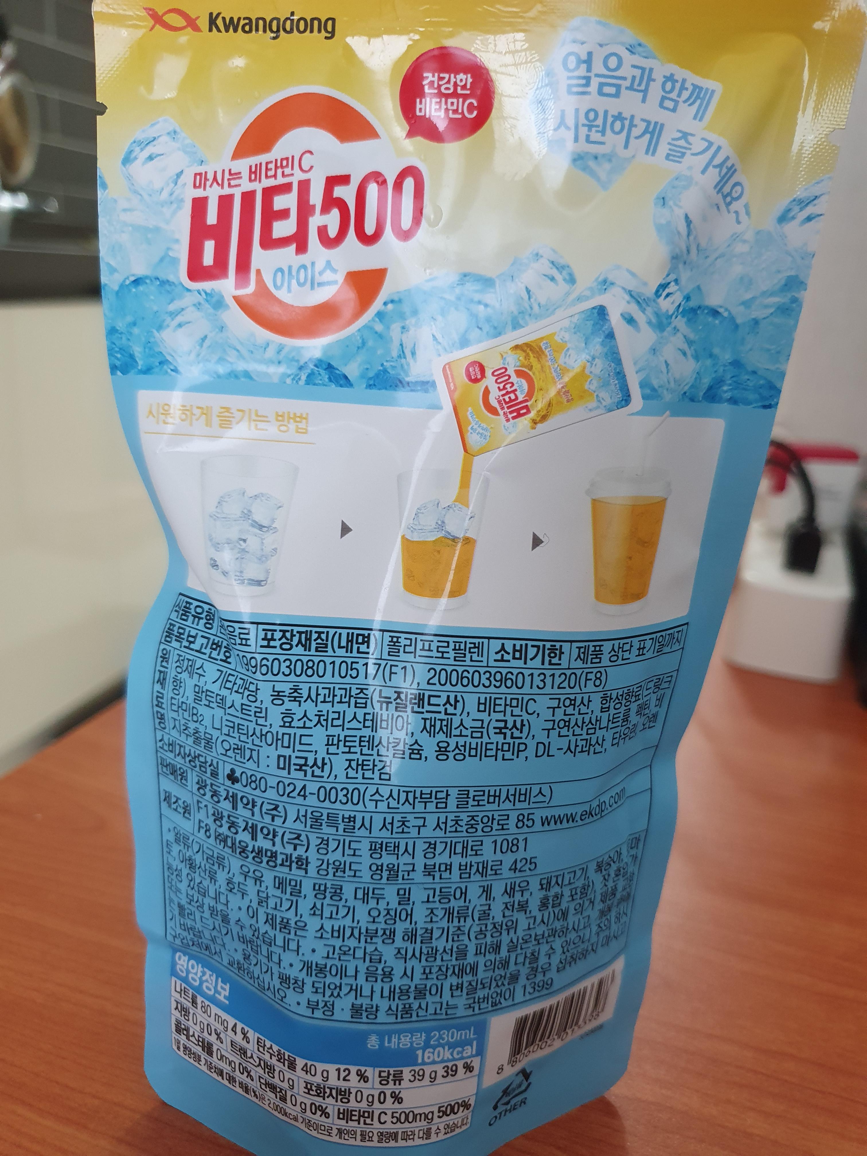 광동의 비타오백 아이스이고 파우치로 되어있어서 간단하게 비타500 파우치라고 불러도 될 것 같다. 다만, 제품명이 '비타500 아이스'이니까 그냥 이렇게 부르겠다.