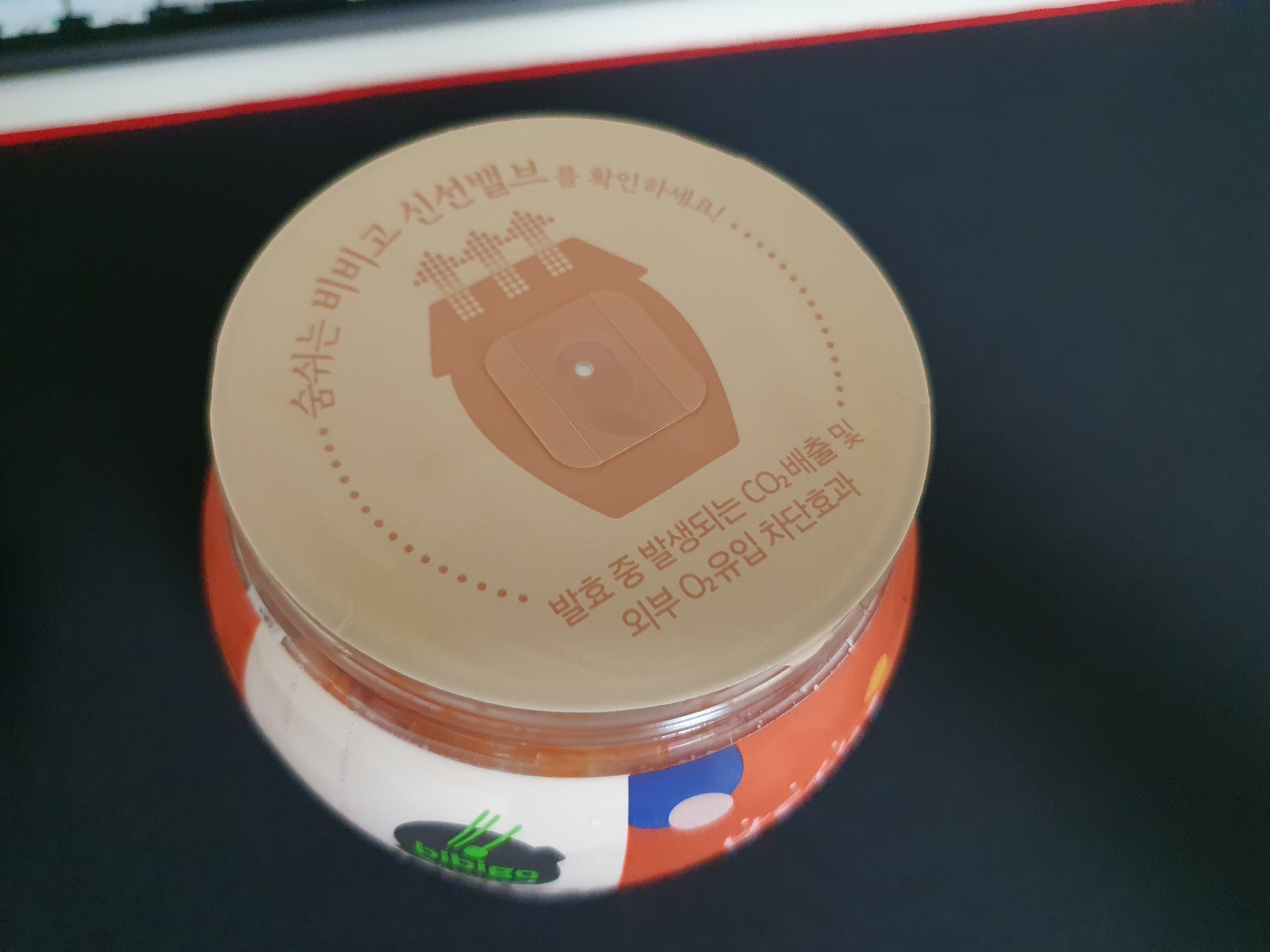 용기에 담긴 비비고 김치는 숨쉬는 비비고 신선밸브가 부착되어있다. 발효 중에 발생되게 되는 CO2를 배출하고 외부 O2는 유입되지 않도록 차단하는 효과가 있다고 한다. 김치의 맛을 더 잘 유지시킨다는 얘기가 되겠다.
