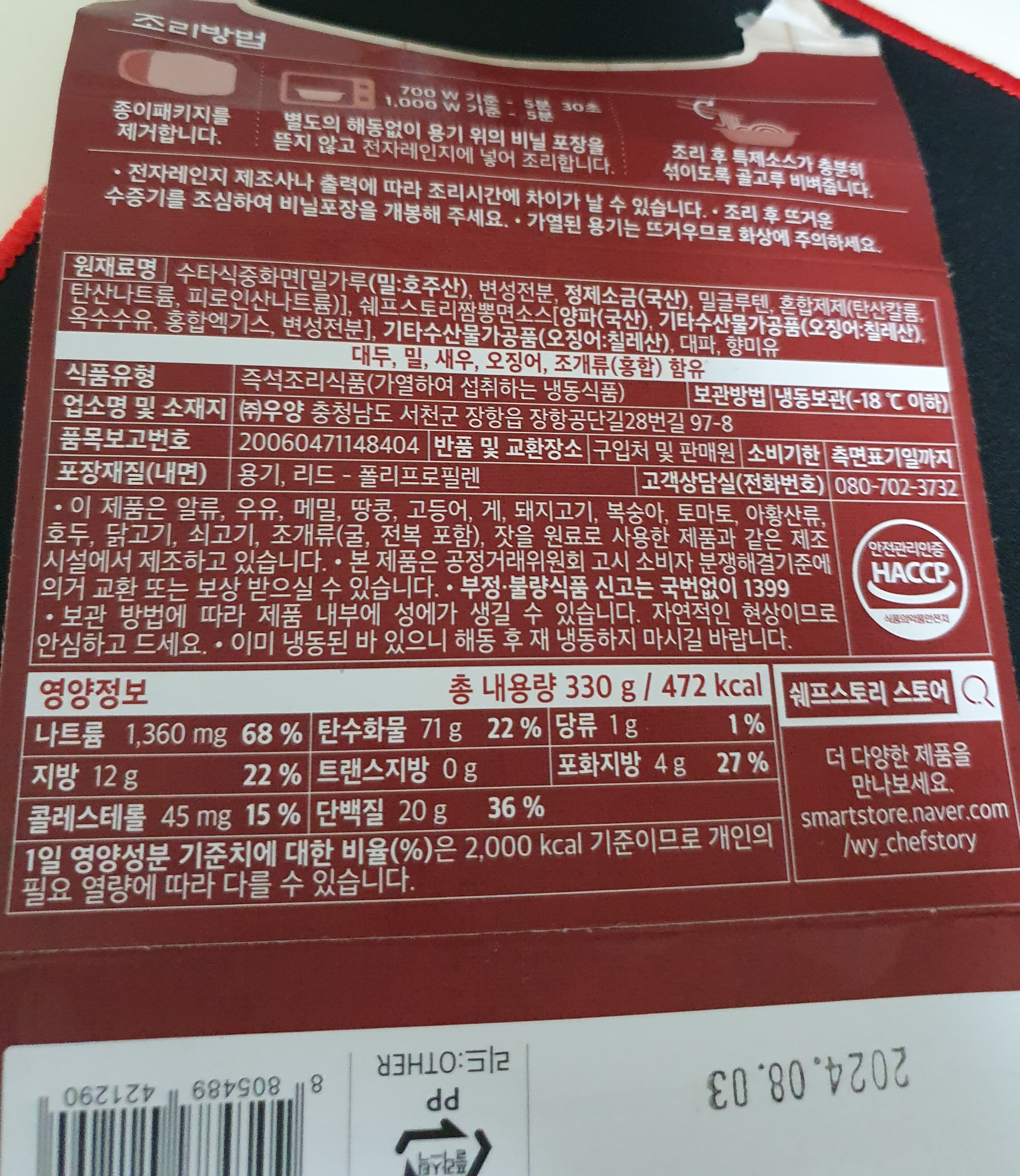 칼로리는 472칼로리여서 이거에 뭐 하나 더 먹으면 한끼 식사 정도는 될 수 있다. 내용량은 330g이다. 오른쪽 최상단을 보니 '우양'이라 적혀있다. 유통하는 곳인가 보다.
